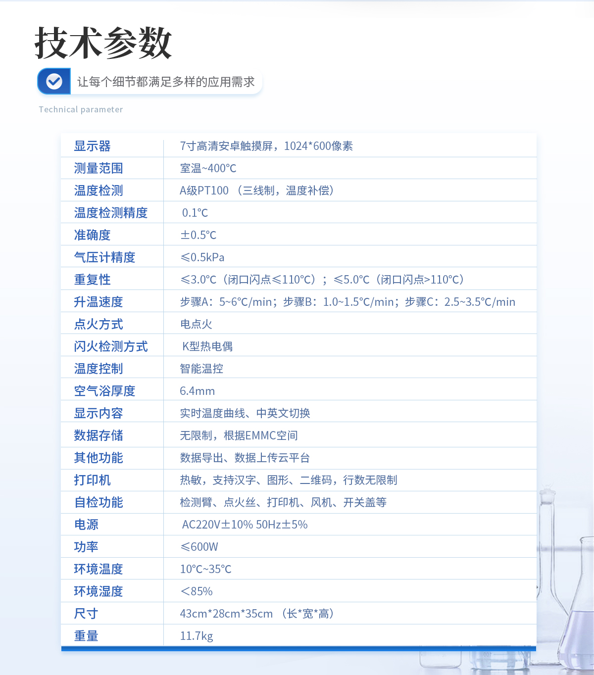 | 显示器:7寸高清安卓触摸屏,1024*600像素 | 测量范围:室温~400℃ | 温度检测: A级PT100 (三线制,温度补偿) | 温度检测精度:0.1℃ | 气压计精度: ≤0.5kPa | 重复性:≤3.0℃(闭口闪点≤110℃);≤5.0℃(闭口闪点>110℃) | 升温速度:步骤A:5~6℃/min;步骤B:1.0~1.5℃/min;步骤C:2.5~3.5℃/min | 点火方式:电点火 | 闪火检测方式:K型热电偶 | 温度控制:智能温控 | 空气浴厚度:6.4mm | 显示内容:实时温度曲线、中英文切换 | 数据存储:无限制,根据EMMC空间 | 其他功能:数据导出、数据上传云平台 | 打印机:热敏,支持汉字、图形、二维码,行数无限制 | 自检功能:检测臂、点火丝、打印机、风机、开关盖等 | 电源:AC220V±10% 50Hz±5% | 功率:≤600W | 环境温度:10℃~35℃ | 环境湿度:<85% | 尺寸:43cm*28cm*35cm (长*宽*高) | 重量:11.7kg |