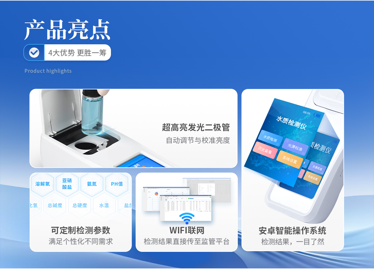 | 快速检测水体中磷酸盐指标 | 安卓智能系统操作更佳简便快捷 | 内置操作流程、操作简单、无需培训、直接上手 | 检测速度快,现场读取数据 | 便携式体积小,重量轻,方便户外检测 | 外形小巧美观,工作稳定免维护,具有较好的性价比 | 采用进口冷光源,光学性能稳定,寿命长达10万小时 |