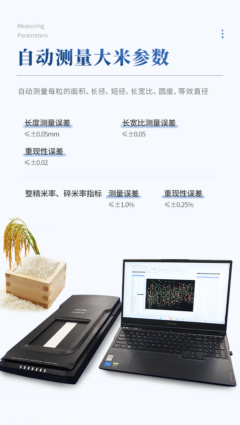 3、自动测量每粒的面积、长径、短径、长宽比、圆度、等效直径(长度测量误差≤±0.05mm,长宽比测量误差≤±0.05,重现性误差≤±0.02;整精米率、碎米率指标测量误差≤±1.0%、重现性误差≤±0.25%)。