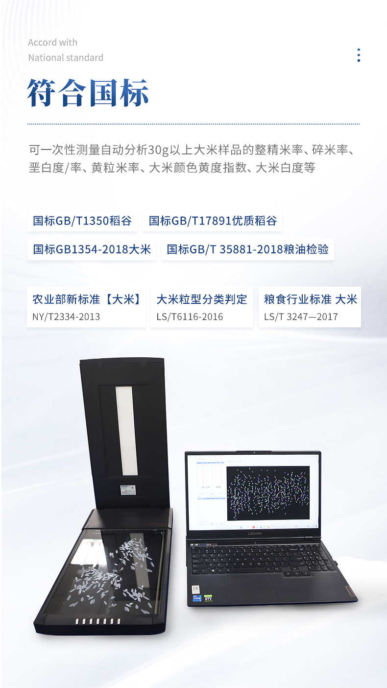 5、可大批量自动分析处理与输出结果。与国标GB/T1350稻谷、GB/T17891优质稻谷或GB1354-2018大米、农业部新标准【大米】NY/T2334-2013、大米粒型分类判定LS/T6116-2016、粮食行业标准 大米LS/T 3247—2017、GB/T 35881-2018粮油检验 稻谷黄粒米含量测定图像分析法等标准相对应,检测各项指标的质量比和粒数比。