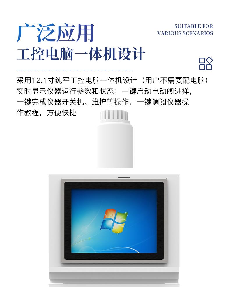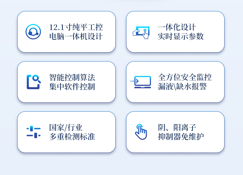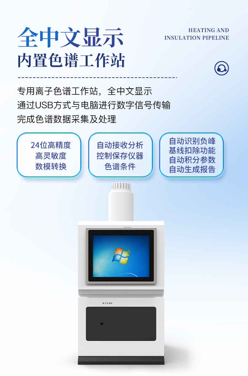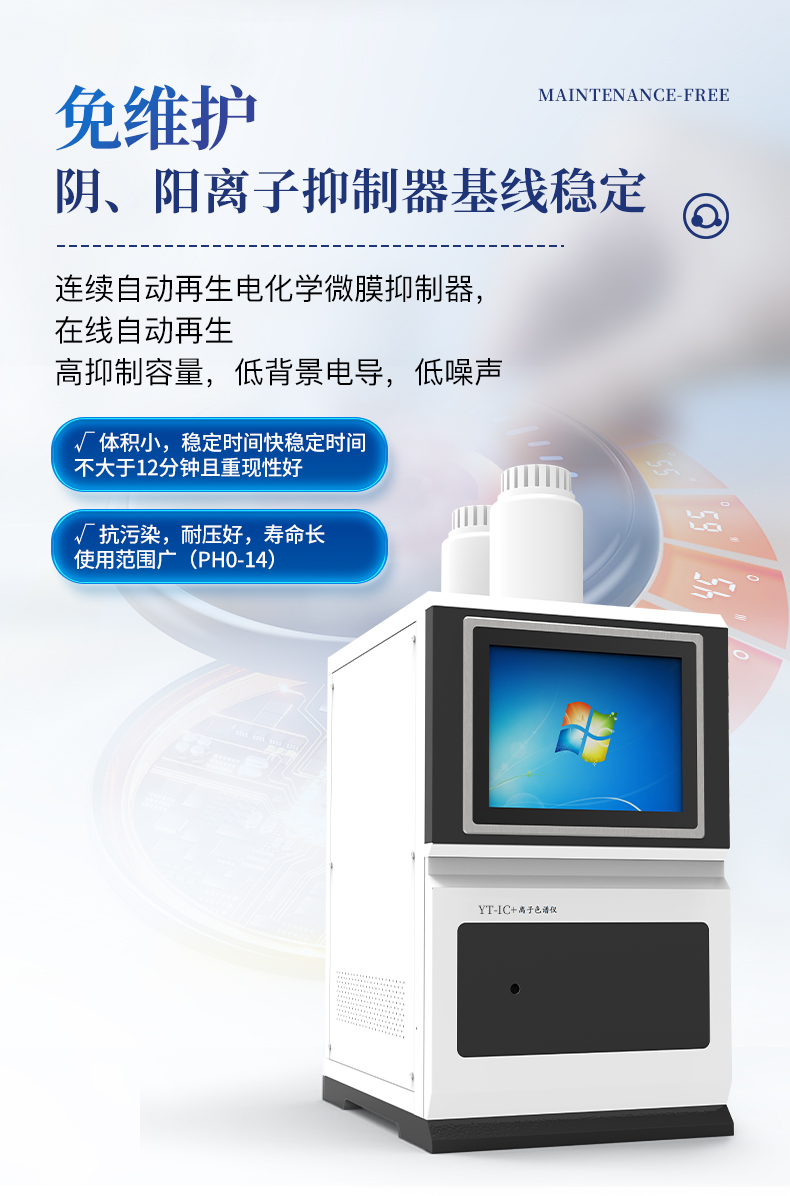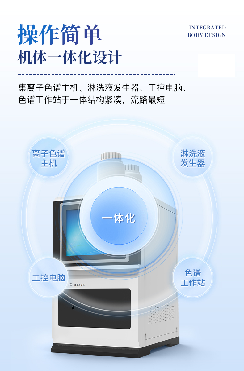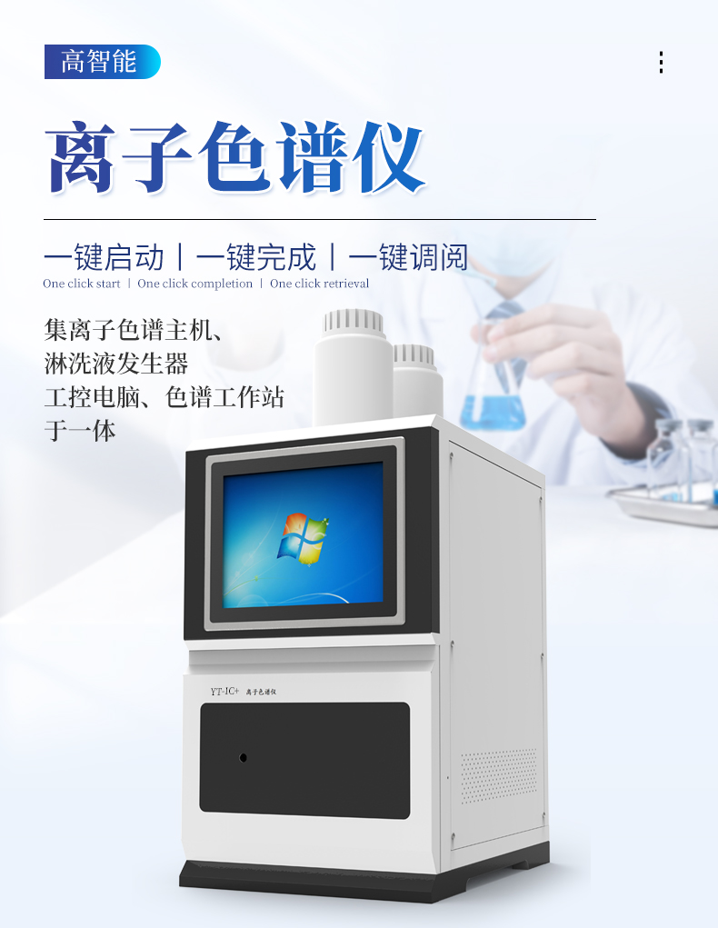| 我们公司作为离子色谱仪器市场的新业态,一直致力于为用户提供更快捷、优质的仪器,以保障实验室的建设和运行。始终坚持以客户为中心,为有检测需求的客户服务。物美价廉、响应迅捷、服务全面。 | 全新一代离子色谱仪,采用12.1吋纯平工控电脑一体机设计(用户不需要配电脑),实时显示仪器运行参数和状态;一键启动电动阀进样,一键完成仪器开关机、维护等操作,一键调阅仪器操作教程,方便快捷。 | 离子色谱仪核心零部件自主研发、自主知识产权可控。采用一体化设计,集离子色谱主机、淋洗液发生器、工控电脑、色谱工作站于一体,结构紧凑,流路*短,对流路造成的峰型扩展有很好的改善。一体化恒温箱:色谱柱、抑制器、电导池、放大电路都处于同一恒温系统,改善了电导检测器的温飘和基线噪声。内置多处漏液报警器和缺水报警器,全方位安全监控。由PLC控制的各个部件统一到电脑显示屏的集中软件控制系统,操作方便,鼠标所见即所控。 |