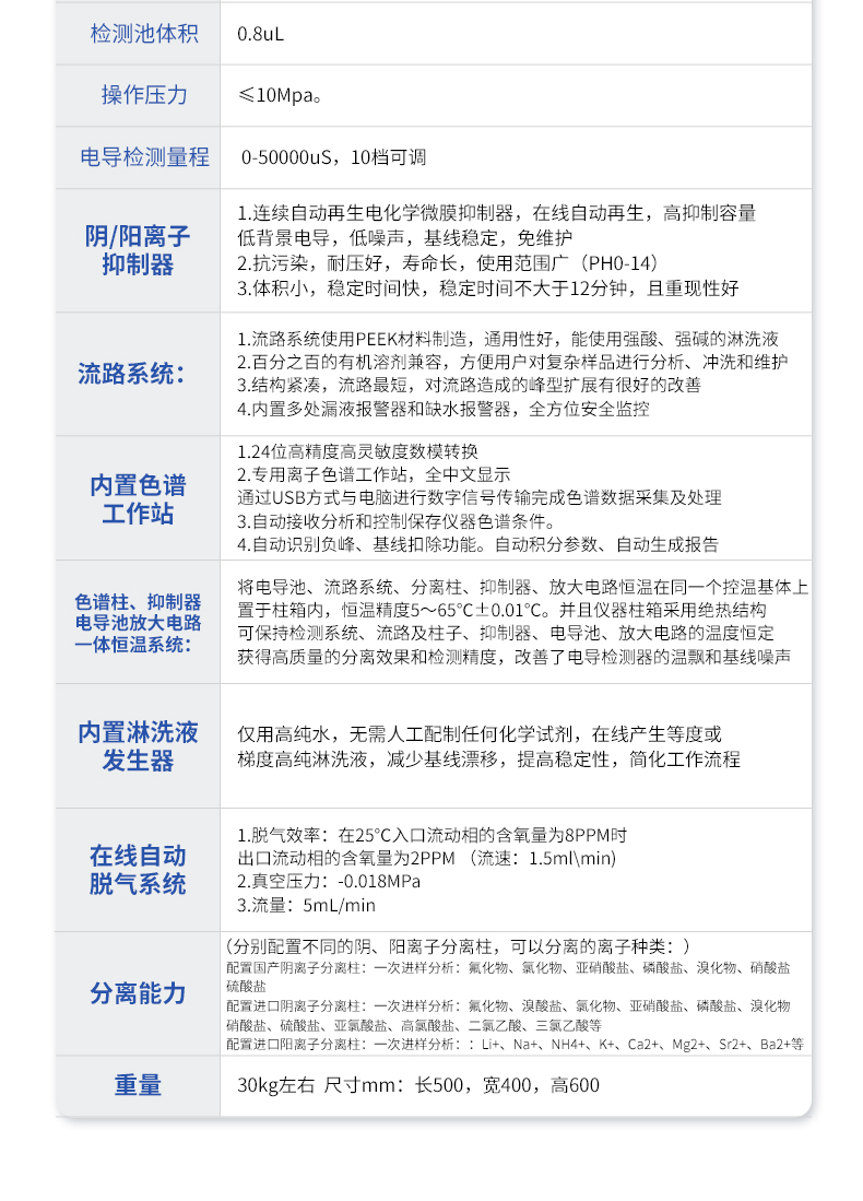 微处理器控制的双柱塞往复泵,采用**的智能控制算法,能使泵的流量脉动降至**水平。 1.1,材质:镶嵌式PEEK材料无阻尼泵头,PEEK管路,适合于pH为0~14的淋洗液及反相有机溶剂。 1.2,流量范围:0.001~9.999ml/min,增量0.001ml/min。 1.3,流量设定值误差:≤0.1% 1.4,流量稳定性:≤0.1% 1.5,工作压力:35MPa 1.6,过压?;ぃ汗ぷ餮沽Τ虻陀谏瓒ǖ纳舷藁蛳孪奘?,泵将自行关闭且报警。 | 2 电导检测器: 2.1,原理:五极电导检测器 2.2,电极材料:钝化316L不锈钢 2.3,基线噪音:≤0.002μS/cm 2.4,基线漂移:≤0.008μS/cm·30min 2.5,zui小检出浓度:≤0.0005ug/mL(以Cl-计) 2.6,仪器线性:≥0.9995 2.7,定量重复性:≤0.1%(以Cl-计) 2.8,定性重复性:≤0.1%(以Cl-计) 2.9,测量范围:0~50000us/cm 2.10,分辨率:≤0.0020ns/cm 2.11,检测池体积:0.8uL 2.12,操作压力:≤10Mpa。 2.13,电导检测量程: 0-50000uS,10档可调。 | 3、 阴、阳离子抑制器: 3.1连续自动再生电化学微膜抑制器,在线自动再生,高抑制容量,低背景电导,低噪声,基线稳定,免维护。 3.2抗污染,耐压好,寿命长,使用范围广(PH0-14)。 3.3体积小,稳定时间快,稳定时间不大于12分钟,且重现性好。 | 4 流路系统: 4.1流路系统使用PEEK材料制造,通用性好,能使用强酸、强碱的淋洗液。 4.2百分之百的有机溶剂兼容,方便用户对复杂样品进行分析、冲洗和维护。 4.3 结构紧凑,流路*短,对流路造成的峰型扩展有很好的改善。 4.4 内置多处漏液报警器和缺水报警器,全方位安全监控。 | 5 内置色谱工作站: 5.1 24位高精度高灵敏度数模转换。 5.2专用离子色谱工作站,全中文显示,通过USB方式与电脑进行数字信号传输,完成色谱数据采集及处理。 5.3自动接收分析和控制保存仪器色谱条件。 5.4自动识别负峰、基线扣除功能。自动积分参数、自动生成报告。 | 6 色谱柱、抑制器、电导池、放大电路一体恒温系统: 将电导池、流路系统、分离柱、抑制器、放大电路恒温在同一个控温基体上置于柱箱内,恒温精度5~65℃±0.01℃。并且仪器柱箱采用绝热结构,可保持检测系统、流路及柱子、抑制器、电导池、放大电路的温度恒定,获得高质量的分离效果和检测精度,改善了电导检测器的温飘和基线噪声。 | 7内置淋洗液发生器,仅用高纯水,无需人工配制任何化学试剂,在线产生等度或梯度高纯淋洗液,减少基线漂移,提高稳定性,简化工作流程。 | 8 在线自动脱气系统: 1,脱气效率:在25℃入口流动相的含氧量为8PPM时,出口流动相的含氧量为2PPM (流速:1.5mlmin) 2,真空压力:-0.018MPa 3,流量:5mL/min | 9 分离能力:(分别配置不同的阴、阳离子分离柱,可以分离的离子种类:) 配置国产阴离子分离柱:一次进样分析:氟化物、氯化物、亚硝酸盐、磷酸盐、溴化物、硝酸盐、硫酸盐 配置进口阴离子分离柱:一次进样分析:氟化物、溴酸盐、氯化物、亚硝酸盐、磷酸盐、溴化物、硝酸盐、硫酸盐、亚氯酸盐、高氯酸盐、二氯乙酸、三氯乙酸等 配置进口阳离子分离柱:一次进样分析::Li+、Na+、NH4+、K+、Ca2+、Mg2+、Sr2+、Ba2+等 | 10 重量:30kg左右 尺寸mm:长500,宽400,高600 |