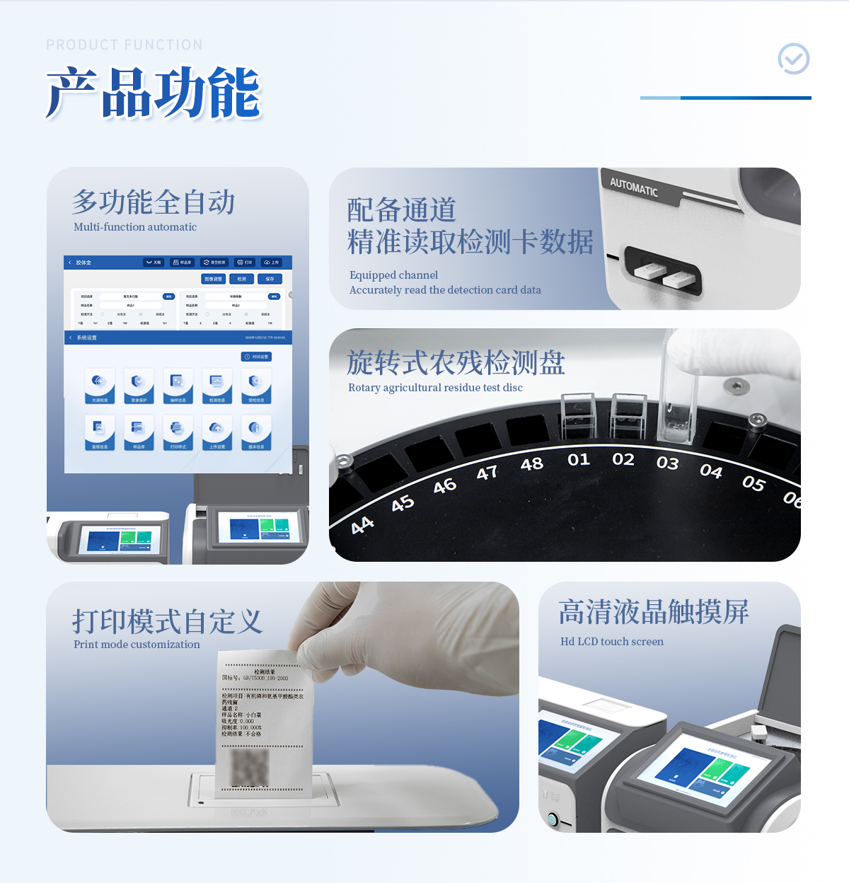 | 1. 试剂位置:3个 | 2. 农残检测盘:旋转24通道比色盘,可任意选择检测通道,自动对应选择通道。 | 3. 胶体金通道:2个,可读取检测卡结果,自动采集、处理分析,自动判断检测结果,并具备自动判空功能。 | 4.系统配置:10.1寸高清液晶触摸屏,采用ARM Cortex?-A7,RK3288/4核处理器,运行内存1GB。Android7.1.1 系统分辨率1280×800。 | 5.恒温系统:具有自动加温温控系统,精准恒温37℃,精度±0.1℃。 | 6.添加系统:仪器按照试剂要求自动、按时、按量加入试剂,并且自动对未正常放置的样本或异常的样本进行检查并提示。 | 7.清洗功能:仪器具备回流及自动清洗管路功能,避免试剂污染。 | 8.混匀功能:设备具备自动混匀功能。 | 9.光源校准:设备可自动校准,确保检测准确度。 | 10.实时监控:仪器测试过程中屏幕显示运行状态,可实时查看。 | 11.数据存储:内部存储16GB,可存储500万条数据。 | 12.样品多选功能:设备具备样品一键多选功能,选择样品自动匹配检测通道。 | 13.项目预设:可提前设置单个及多个相同或不相同的检测任务,可单次或者多次调取,减少检测时间。 | 14.自定义打印系统:内置自定义打印系统,可按需灵活设置开启或关闭:产品合格证(国家农业部标准),二维码,抽样信息、检测信息,受检信息等信息的打印。 | 15.A4版本报告打印功能:设备可自动生成A4版报告,A4报告带二维码,可扫描二维码生成电子版,并可识别真伪。 | 16.传输方式:仪器配备无线通信模块: 4G(APN)通讯???、Wifi??椋堆来淠??,同时具有USB接口以及RJ45接口能以多种方式实现数据保存和数据传输功能,设备数据可以同步上传至平台。 | 17.系统17.数据监管系统:设备自带监管平台,并可同步对接监管平台,数据可局域网和互联网数据上传,检测结果可直接传至食品安全监管平台。达到食品安全问题预估、预警。 | 18.系统远程更新功能:无需设备返厂,即可远程实时升级全新系统,节省时间成本及避免运输造成设备损。 |