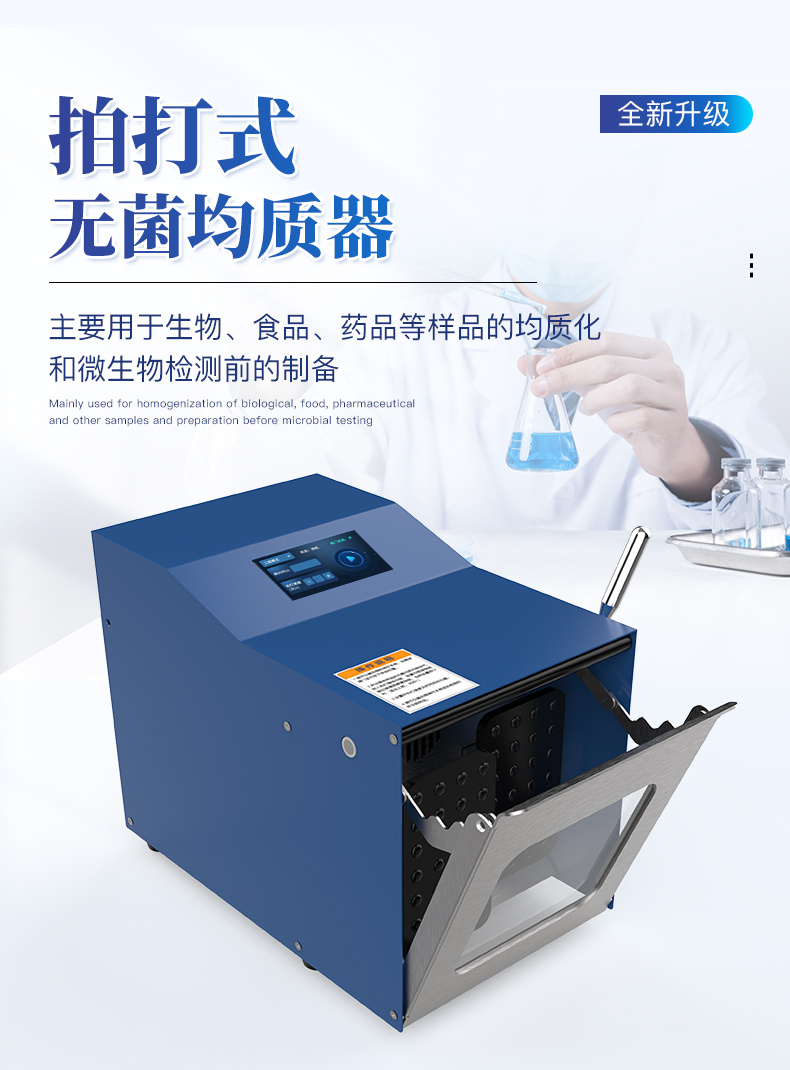 | 食品检测:肉类、乳制品、果蔬等微生物分析。 | 药品/化妆品:均匀分散有效成分或检测微生物。 | 环境科学:土壤、废水等样品的均质处理。 |
