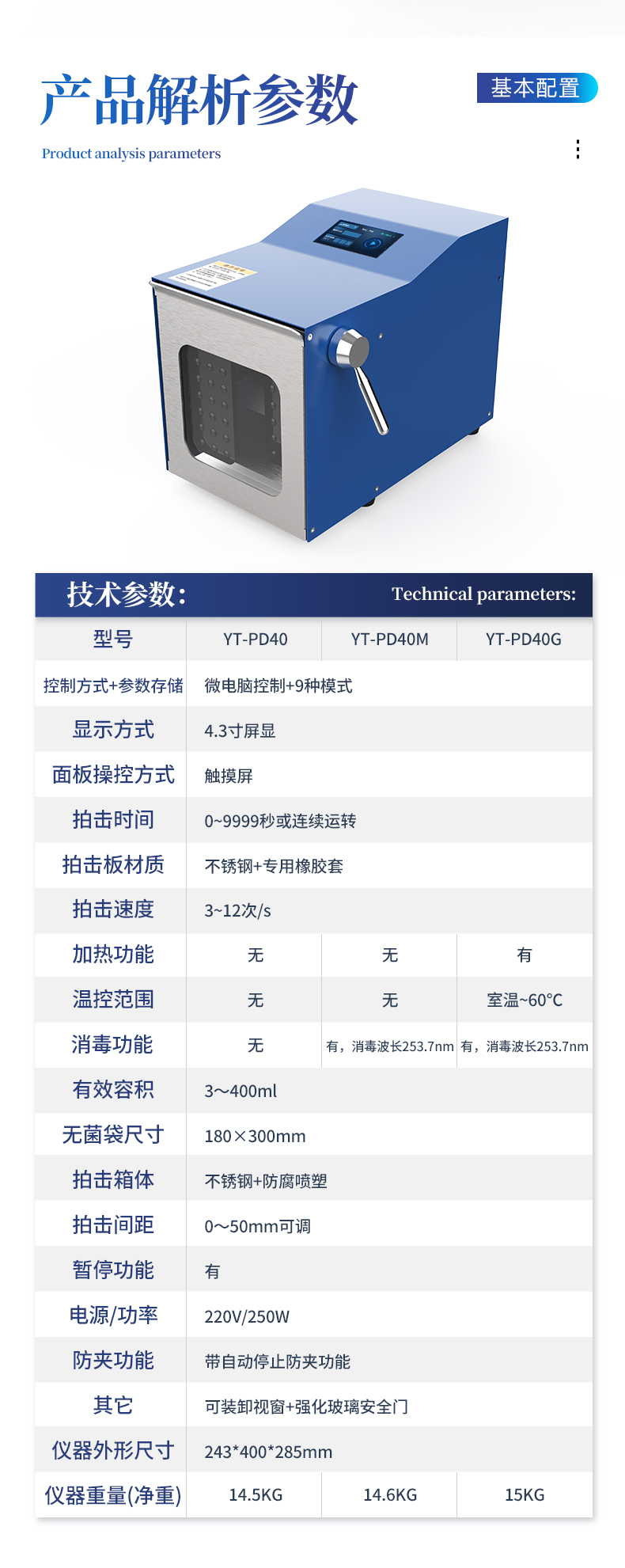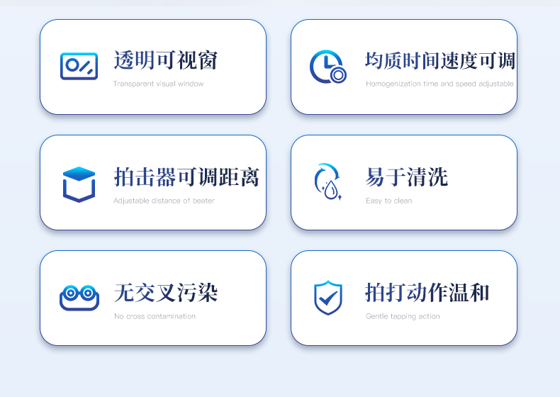 | 1. 拍打动作温和,避免过度破碎,适合微生物检测。 | 2. 使用一次性无菌袋,无交叉污染。 | 3. 均质时间、拍打速度可调。 | 4. 可储存九组工作程序,一键操作。 | 5. 拍击器可调整前后距离。 | 6. 全开启式门,易于清洗。 | 7. 带有透明可视窗,方便观察样品均质效果。 | 8. 开门?;繁0踩?。 |
