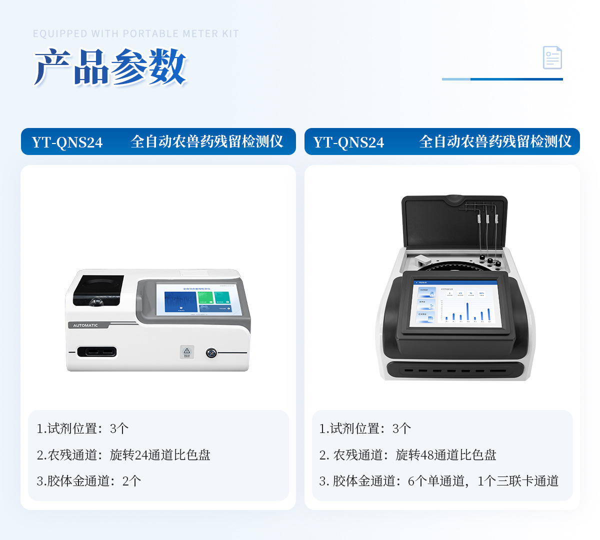 | 1. 试剂位置:3个 | 2. 农残检测盘:旋转24通道比色盘,可任意选择检测通道,自动对应选择通道。 | 3. 胶体金通道:2个,可读取检测卡结果,自动采集、处理分析,自动判断检测结果,并具备自动判空功能。 | 4.系统配置:10.1寸高清液晶触摸屏,采用ARM Cortex?-A7,RK3288/4核处理器,运行内存1GB。Android7.1.1 系统分辨率1280×800。 | 5.恒温系统:具有自动加温温控系统,精准恒温37℃,精度±0.1℃。 | 6.添加系统:仪器按照试剂要求自动、按时、按量加入试剂,并且自动对未正常放置的样本或异常的样本进行检查并提示。 | 7.清洗功能:仪器具备回流及自动清洗管路功能,避免试剂污染。 | 8.混匀功能:设备具备自动混匀功能。 | 9.光源校准:设备可自动校准,确保检测准确度。 | 10.实时监控:仪器测试过程中屏幕显示运行状态,可实时查看。 | 11.数据存储:内部存储16GB,可存储500万条数据。 | 12.样品多选功能:设备具备样品一键多选功能,选择样品自动匹配检测通道。 | 13.项目预设:可提前设置单个及多个相同或不相同的检测任务,可单次或者多次调取,减少检测时间。 | 14.自定义打印系统:内置自定义打印系统,可按需灵活设置开启或关闭:产品合格证(国家农业部标准),二维码,抽样信息、检测信息,受检信息等信息的打印。 | 15.A4版本报告打印功能:设备可自动生成A4版报告,A4报告带二维码,可扫描二维码生成电子版,并可识别真伪。 | 16.传输方式:仪器配备无线通信??椋?4G(APN)通讯模块、Wifi??椋堆来淠??,同时具有USB接口以及RJ45接口能以多种方式实现数据保存和数据传输功能,设备数据可以同步上传至平台。 | 17.系统17.数据监管系统:设备自带监管平台,并可同步对接监管平台,数据可局域网和互联网数据上传,检测结果可直接传至食品安全监管平台。达到食品安全问题预估、预警。 | 18.系统远程更新功能:无需设备返厂,即可远程实时升级全新系统,节省时间成本及避免运输造成设备损。 |