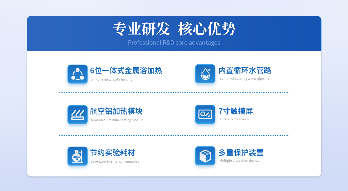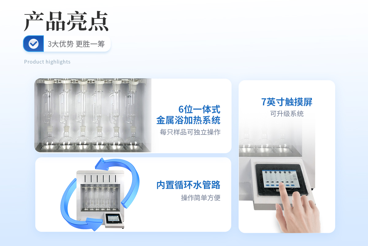 | 1.7英寸大液晶触摸屏显示控制,可升级程序控温和远程操作系统 | 2.6位一体式金属浴加热系统,保证每只样品可独立操作 | 3.航空铝加热???,升温速度快,回流速度快,大大缩短提取时间 | 4.进口温度传感器,控温精度高,均匀性好 | 5.自带加热萃取、淋洗溶剂回收功能,大大节约实验耗材 | 6.内置循环水管路,操作简单方便(可升级为内置冷却装置) | 7.具有过压,过热,漏电多重保护装置,无需看管,保证机器长时间使用的安全性 | 8.可升级成内置冷水系统,无需外接水源。具有计时和时间控制的循环系统;冷却水全自动控制。 |