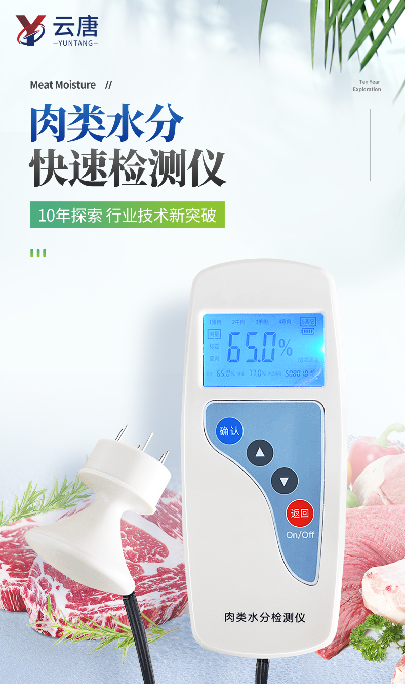 肉类水分检测仪主要用于快速猪肉、牛肉、鸡肉等动物肉类水分含量,从而判断所测样品是否为注水肉,该仪器设计精巧,单手可持,仪器可根据测定对象的品种,设定相应的判断标准值。