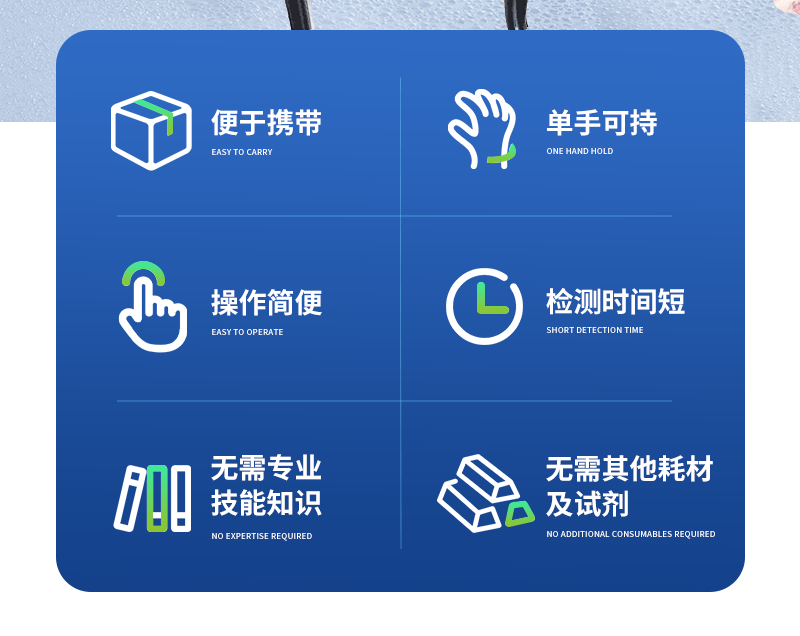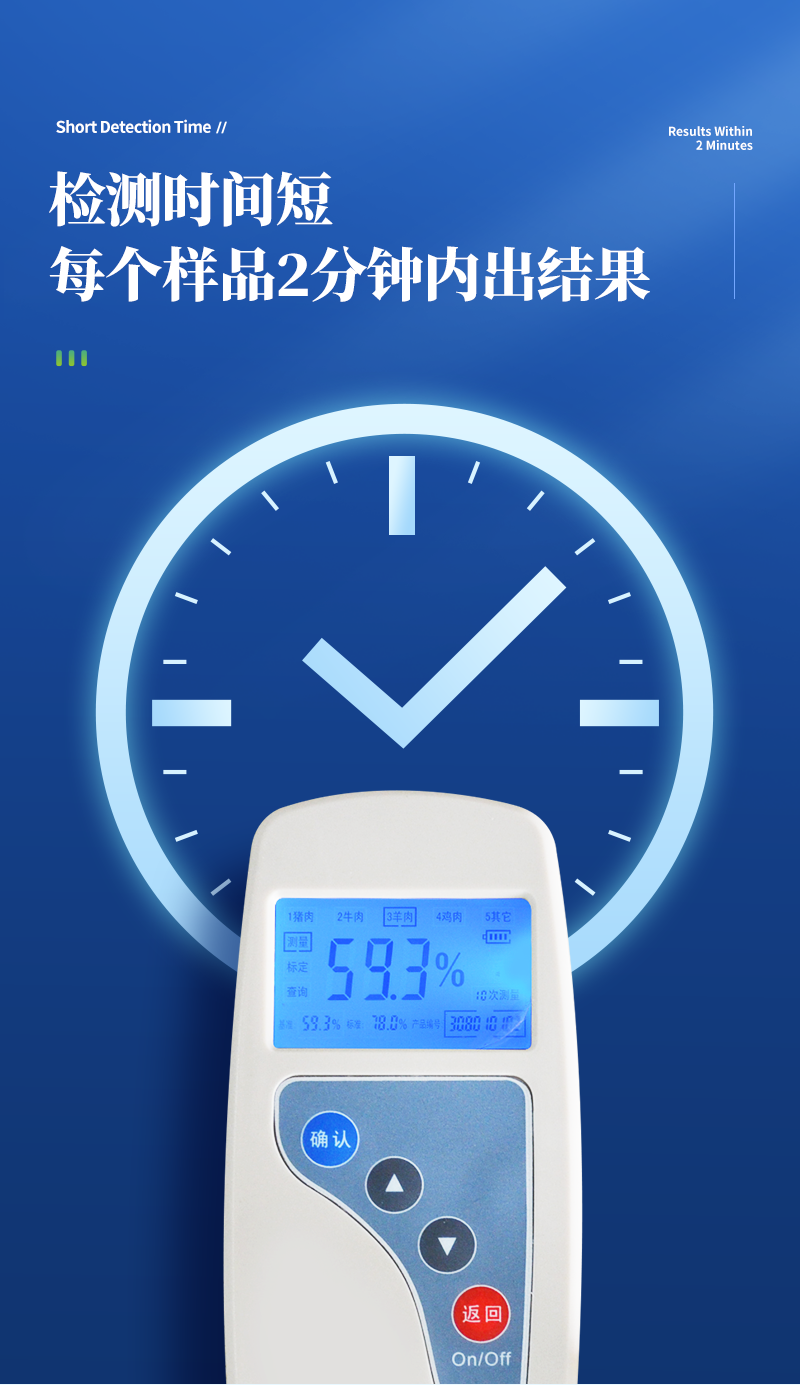 | 便于携带,单手可持 | 可根据测定对象的品种,设定相应的判断标准值 | 操作简便,检测人员无需专业技能知识 | 检测时间短,每个样品2分钟内出结果; | 检测试验无需其他耗材及试剂 |