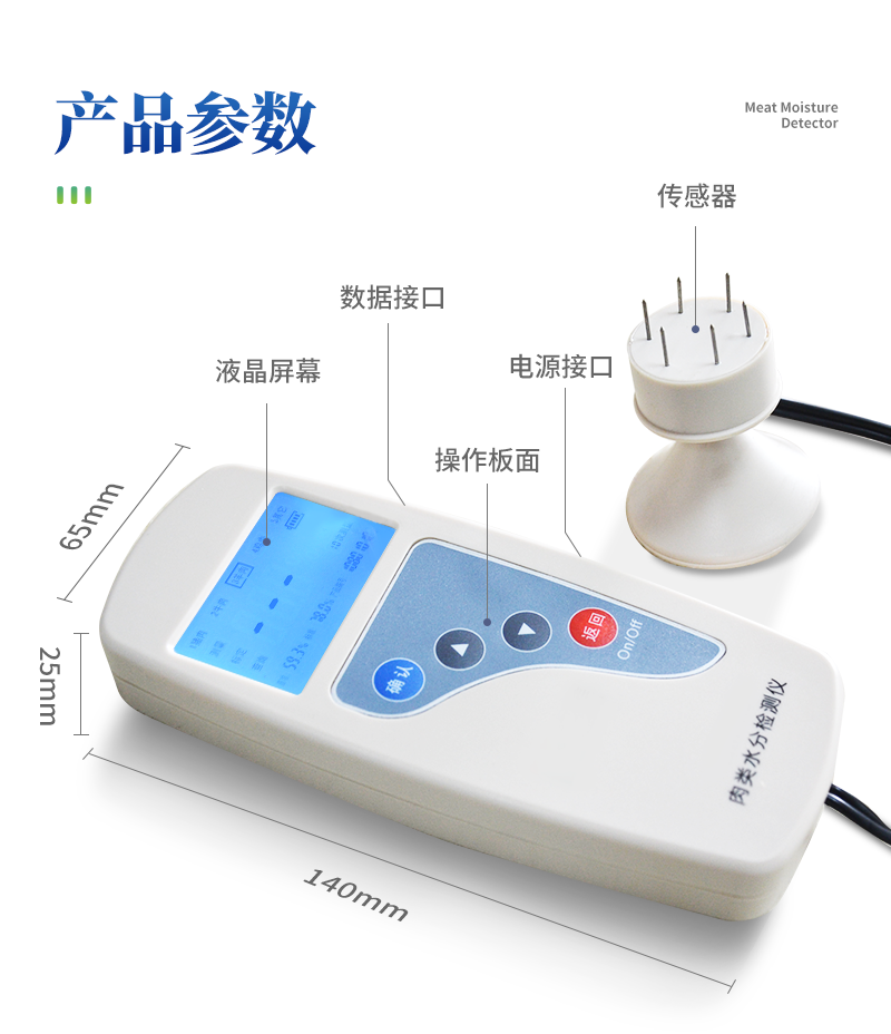 产品简介: 肉类水分检测仪主要用于快速猪肉、牛肉、鸡肉等动物肉类水分含量,从而判断所测样品是否为注水肉,该仪器设计精巧,单手可持,仪器可根据测定对象的品种,设定相应的判断标准值。 产···