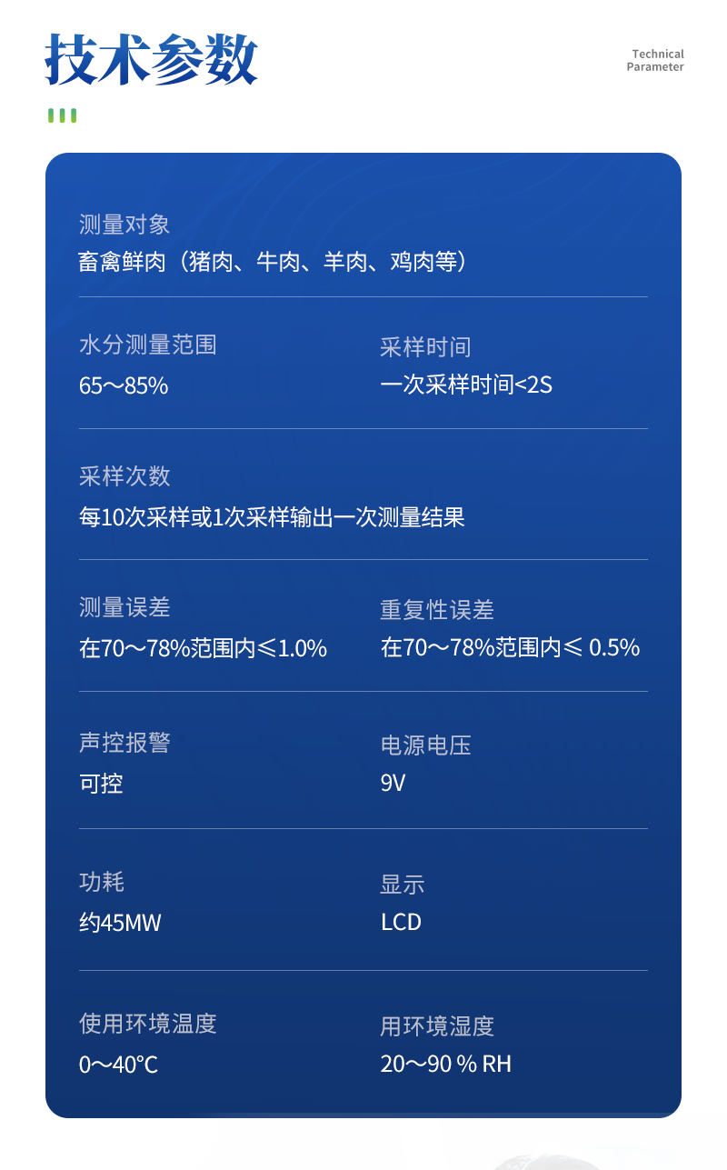 | 畜禽鲜肉(猪肉、牛肉、羊肉、鸡肉等) | 65~85% | 一次采样时间< 1s | 每10次采样或1次采样输出一次测量结果 | 在70~78%范围内≤1.0% | 在70~78%范围内≤ 0.5% | 超标报警 | 可设定每个品种的判断标准。 | 交直流两用 | 触摸式按键 | 45mW | 167×70×30mm | 蓝色背光LCD | 0~40℃ | 20~90 % RH | USB接口 |