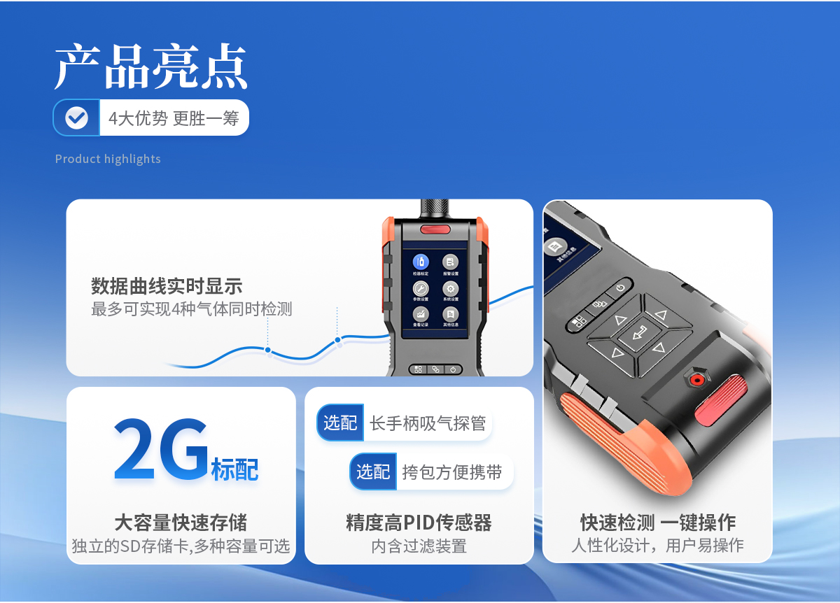 | 1、快速** | 采用原装进口PID传感器,精度高 | 仪器内含过滤装置,**过滤油、水、粉尘等杂质 | 即使在*严苛的工业环境中,检测结果依然可以信赖 | 2、人性化设计,用户易操作 | 3.5寸高清彩屏,开机即可检测 | 纯硬件一键开关机, 减小电量消耗 | 选配长手柄吸气探管 | 选配挎包方便随身携带 | “跑车”造型,美观大方 | 3、功能全面 | 同时显示实现数据和浓度曲线 | 配置高低速可调的气泵 | *多可实现4种气体同时检测 | 可选配外置蓝牙打印机,检测数据实现移动打印 | 可选配蓝牙、ZIGBEE等多种无线通讯方式 | 支持多种气体显示单位任意切换,浓度值由系统自动换算 | 中英文自由切换显示 | 大容量快速存储功能,存储空间可以定制 | Micro-USB接口充电器,方便随时充电 | 安卓手机通用数据线,方便连接电脑读取历史数据 | 可以在高温、高湿、高粉尘环境气体检测(需配采样探枪) |