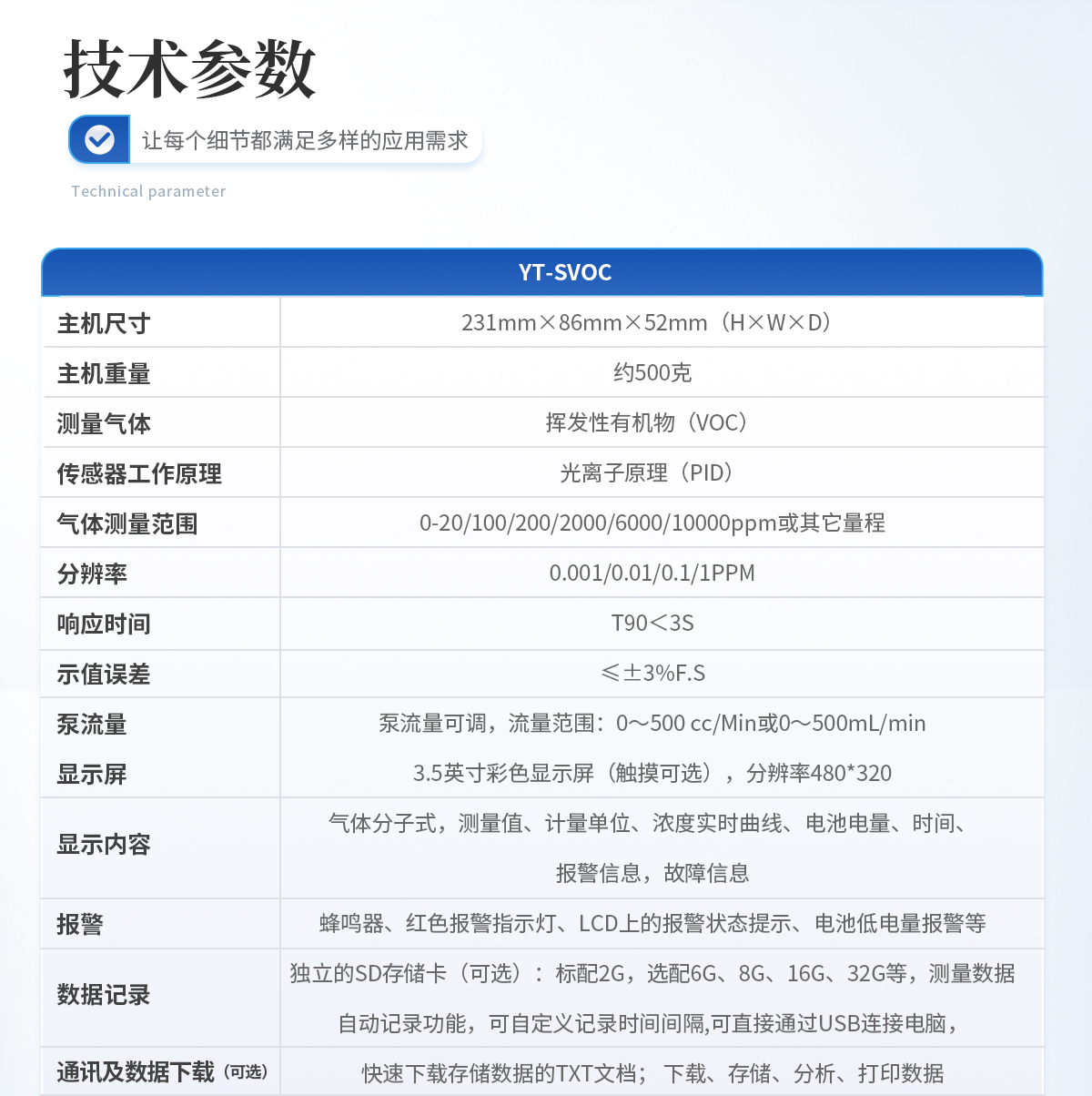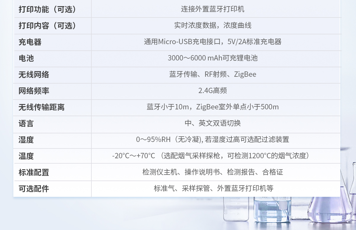| 主机尺寸:(H x W x D)231*86*52mm | 主机重量:约500克 | 测量气体:挥发性有机物(VOC) | 传感器工作原理:光离子原理(PID); | 气体测量范围 :0-20/100/200/2000/6000/10000ppm或其它量程 | 分辨率:0.001/0.01/0.1/1PPM | 响应时间 :T90<3S | 示值误差: ≤±3%F.S | 泵流量:泵流量可调,流量范围:0~500 cc/Min或0~500mL/min | 显示屏:3.5寸彩色显示屏(触摸可?。直媛?80*320 | 显示内容:气体分子式,测量值、计量单位、浓度实时曲线、电池电量、时间、报警信息,故障信息 | 报 警:蜂鸣器、红色报警指示灯、LCD上的报警状态提示、电池低电量报警等 | 数据记录:独立的SD存储卡(可?。罕昱?G,选配6G、8G、16G、32G等 测量数据自动记录功能,可自定义记录时间间隔 | 通讯及数据下载 (可选):可直接通过USB连接电脑,快速下载存储数据的TXT文档; 下载、存储、分析、打印数据 | 打印功能(可?。?连接外置蓝牙打印机 | 打印内容(可?。?实时浓度数据, 浓度曲线 | 充电器:通用Micro-USB充电接口,5V/2A标准充电器 | 电池:3000~6000 mAh可充锂电池 | 无线网络:蓝牙传输、RF射频、ZigBee | 网络频率 :2.4G高频 | 无线传输距离 :蓝牙小于10m,ZigBee室外单点小于500m | 语 言:中、英文双语切换 | 湿 度:0~95%RH(无冷凝), 若湿度过高可选配过滤装置 | 温 度:-20℃~ +70℃ (选配烟气采样探枪,可检测1200℃的烟气浓度) |