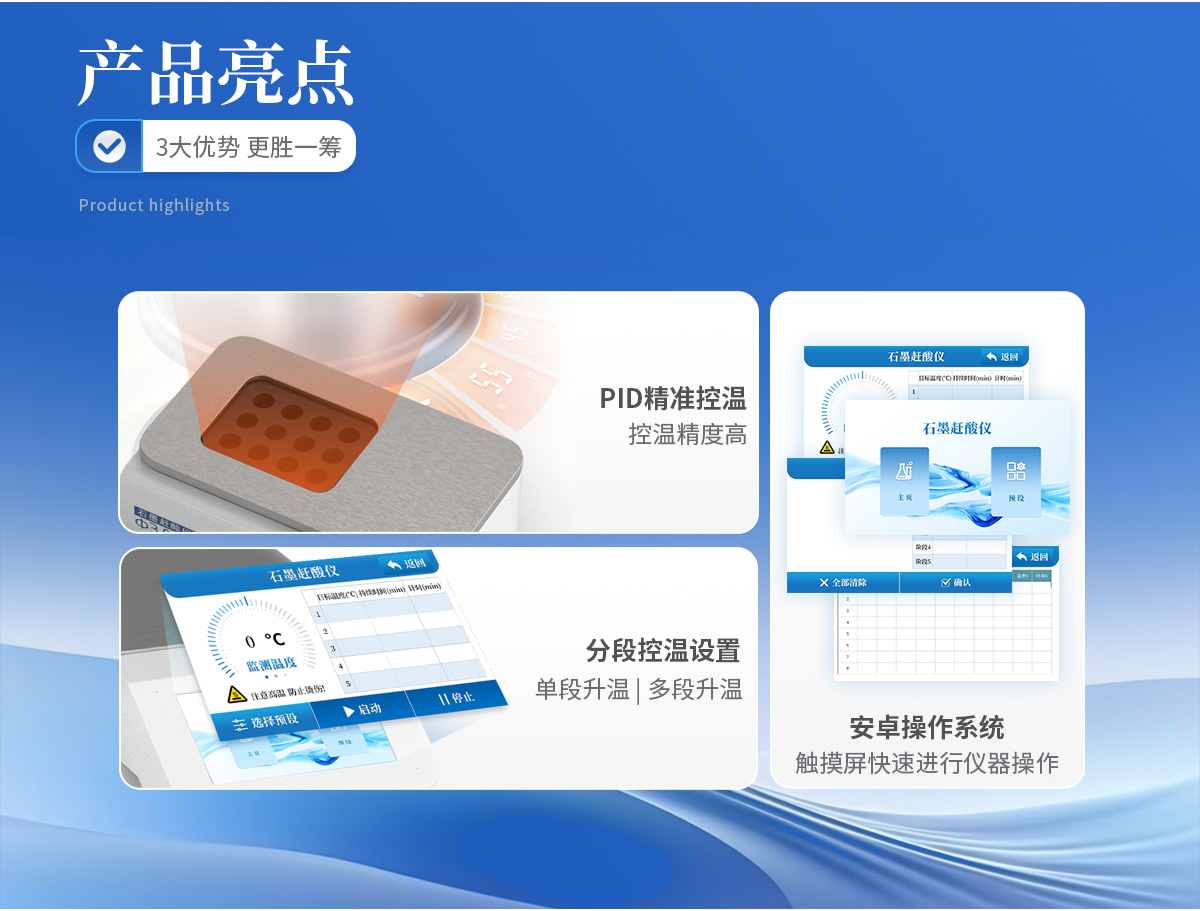 | 使用5寸彩色触摸屏进行仪器操作,配备安卓操作系统,方便快捷。 | 采用PID 控温技术,控温精度高,升温速度快, 从室温到260℃仅需25分钟。 | 分段控温设置,即可单段升温,也可多段升温,设置灵活,仪器将自动按顺序完成。更适于易产生泡沫的样品。 | 采用优质石墨炉内芯,平均温差较小,样品效果一致性好,热传导效率更高。石墨块具有特氟龙涂层,耐腐蚀,延长使用寿命。 |
