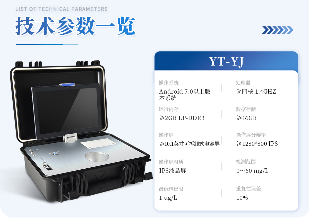 | 基本概述:便携式箱体化一体机,采用防水、抗压、防撞击、防腐蚀箱体设计,满足车载环境、无电源环境以及户外检测需求; | 主机:具备检测功能、辅助功能、管理系统软件、信息化管理功能,信息化实现数据双向传输,能直接接收管理中心下发任务,并实时上报检测结果至管理平台; | 检测技术:采用阳极溶出伏安法检测技术; | 操作系统:Android 7.0以上版本系统; | 处理器:≥四核 1.4GHZ; | 运行内存:≥2GB LP-DDR3; | 数据存储:≥16GB; | 通讯接口:包含两个USB接口、网线接口、WIFI、蓝牙、4G??椋谥肎PS接口,用于户外或者其他移动检测定位; | 指示灯:具有热敏打印机工作指示灯,用于提示打印机工作状态;具有电源充电指示灯,用于提示仪器充电状态;具有无线蓝牙对接状态提示灯,用于提示操作平台与仪器主机连接状态;具有仪器工作状态提示灯,用于提示仪器主机是否处于工作状态; | 操作屏:≥10.1英寸可拆卸式电容屏设计,操作屏可以固定在仪器上,也可以取出单独操作实现运程控制; | 操作屏分辩率:≥1280*800 IPS; | 操作屏材质: IPS液晶屏; | 输入方式:电容屏、触摸输入、支持多点触控; | 采用无汞电极,安全无毒; | ??樽源涟韫δ?,启动后既可自动搅拌溶液。 | 检测范围:0~60 mg/L ,**检出限:1 ug/L; | 重复性误差:10%; | 具有自动寻峰功能,计算出样品**数据; | 内置线性扫描、常规脉冲扫描、微分脉冲扫描; | 仪器现场取证功能:仪器具有800万以上防抖、自动对焦高清摄像头,对检测实样进行现场拍照取证; | 电源控制器:双电源控制器,节省电量; | 运程控制:支持20米内无线蓝牙控制仪器检测,方便使用者没在仪器身边时也能完成项目检测; | 打?。耗谥梦⑿腿让舸蛴』?,可随时打印检测结果; | 电池:内置大容量可充电锂电池,可连续工作5小时以上; | 箱体: 便携一体化手提箱,箱体能防水,抗压,整机重量<5kg,携带方便; |