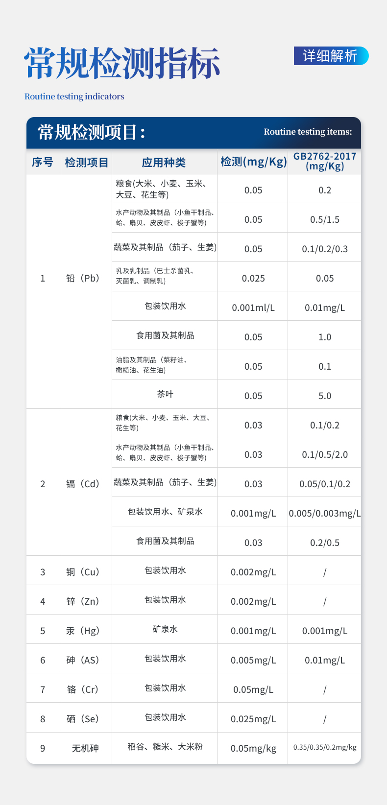 | 1、检测试剂盒:水中重金属铅镉;检测项目:铅、镉;检测对象:水、饮料;检出限(μg/kg):0.5; | 2、检测试剂盒:水中锌检测;检测项目:锌;检测对象:水、饮料;检出限(μg/kg):5; | 3、检测试剂盒:水中铜检测;检测项目:铜;检测对象:水、饮料;检出限(μg/kg):5; | 4、检测试剂盒:水产品中的重金属铅镉;检测项目:铅/镉;检测对象:水产品(甲壳类、双壳类、鱼类制品等;检出限(μg/kg):30; | 5、检测试剂盒:蔬菜中的重金属铅镉检测;检测项目:铅/镉;检测对象:茶叶;检出限(μg/kg):50; | 6、检测试剂盒:蔬菜中的重金属铅镉检测;检测项目:铅/镉;检测对象:辣椒;检出限(μg/kg):30; | 7、检测试剂盒:蔬菜中的重金属铅镉检测;检测项目:铅/镉;检测对象:韭菜;检出限(μg/kg):30/20; | 8、检测试剂盒:蔬菜中的重金属铅镉检测;检测项目:铅/镉;检测对象:生姜;检出限(μg/kg):30/20; | 9、检测试剂盒:食用菌中的重金属铅镉检测;检测项目:铅/镉;检测对象:香菇;检出限(μg/kg):30/20; | 10、检测试剂盒:大米中的重金属铅镉检测;检测项目:铅/镉;检测对象:大米、糙米;检出限(μg/kg):30; | 11、检测试剂盒:小麦中的重金属铅镉检测;检测项目:铅/镉;检测对象:小麦;检出限(μg/kg):30; | 12、检测试剂盒:中药材中的重金属铅镉检测;检测项目:铅/镉;检测对象:中药材(枸杞、黄芪等);检出限(μg/kg):100; |