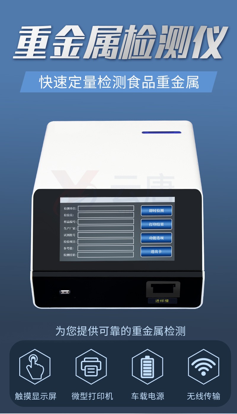 | 1.仪器能同时检测大米、粮食、粮食制品、饲料、饲料原料中重金属镉、铬、铅、铜等指标。 | 2.具有免疫层析胶体金检测快速检测分析方法,可扩展检测真菌毒素、农药残留,系统采用手提或拉杆设计,满足现场及流动检测的需求。 | 3.内置操作系统,一体式电脑控制,无需外接电脑,能耗≦15W,检测数据和位置信息可发送至网络或数据平台,能够与各类监测信息系统实现无缝对接。配合信息管理平台进行区域安全监管及大数据分析处理,方便食品安全问题预估、预警。 | 4.内置无线传输???,USB接口,RS232接口,以太网口,数据既可通过无线和有线连接传输,可添加内置GPS定位???,可实时定位。 | 5.检测仪尺寸:仪器重量3.0kg,7寸彩色电阻触摸显示屏,内存:≥2.05GB,内置微型打印机,无需外接打印设备即可现场打印数据。 | 6.220V电源,车载电源,适合野外现场操作。 | 7.完备的数据库功能(实时显示,存储/20000个以上测试结果、分析、导出、打印、处理检测数据),胶体金检测卡??榇⒋婕锹加屑觳馐奔?、检测单位、检测人员、检测项目、样品编号、检测结果、参考值等。 | 8.免疫层析胶体金检测???/td> | (1)采用扫描成像技术及免疫层析胶体金技术,可实现重金属(镉、铅)快速定量检测分析; | (2)检测卡卡槽:≤8×2×0.5cm,检测方式:扫描,扫描精度CV≤1.0%,检测时间≤5秒,测量重复性≤3%,光源:独立稳定恒流光源,探测器:超敏光电传感器。 | (3)标准曲线录入方式:每批检测卡试剂盒配有标准曲线ID卡,标准曲线录入采用自动读取,检测过程无需准备标准品或质控品校准,操作简单; | (4)检测卡采用两线法设计,定量检测精密度(cv):检测卡批内小于15%、批间小于20%,检测卡采用塑料单卡独立包装,防止检测条因暴露于环境而被污染且便于使用和保存,有效期:常温保存6个月有效,2-8℃保存1年有效; | (5)前处理方法统一:重金属镉和重金属铅前处理方法统一,可一次提取分别检测,提升效率; | (6)重金属镉、铅检测产品具有粮食系统国家级检测机构产品评价报告。 | 9.恒温孵育器 | (1)适用于定量胶体金试纸卡和反应液体**控温反应,以提高准确性; | (2)孵育卡槽采用全封闭设计有利于**控温,孵育器卡槽数6个,孵育孔数:6个,控温温度:37℃,控温精度≤0.5℃,升温速度≤10min,温度均匀性≤0.3℃,实时温度显示精度:0.1℃。 | 10.振荡器 | (1)振荡方式:圆周多种模式混匀,可以触发式点动运行、可长时间连续运行,振荡速度范围广,0-2500rpm/min,低速平稳,高速强劲; | (2)能同时振荡提取8个样品,操作时无需操作人员来固定样品进行振荡,减小个人操作差异,提高检测准确性。 | 11.迷你离心机:转速:1000—12000rpm,可自行设定离心转速和时间,体积:20×18×13cm,重量:1.5kg。 | 12.粉碎机:功率≥0.15 千瓦 破碎粒径:小于 0.15mm 破碎样品基本过 20 目筛网。 | 13.电子称:量程:0~200g,分度值:0.01g,不锈钢称台,LCD 显示器,多种称量单位选择。 | 14.移液器:100~1000μL移液器 1支, 20-200μL移液器 1支,轻巧的移液操作按压力,长时间操作不会造成肌肉损伤,移液结果。 | 15.检测项目 | 1.项目:重金属镉;检出限:0.02ppm;检测范围:0-1ppm | 2.项目:重金属铅;检出限:0.02ppm;检测范围:0-1ppm | 3.项目:重金属铜;检出限:0.2ppm;检测范围:0-20ppm | 4.项目:重金属汞;检出限:0.01ppm;检测范围:0-0.3ppm | 5.项目:重金属铬;检出限:0.05ppm;检测范围:0-5ppm | 6.项目:重金属砷;检出限:0.02ppm;检测范围:0-1ppm |