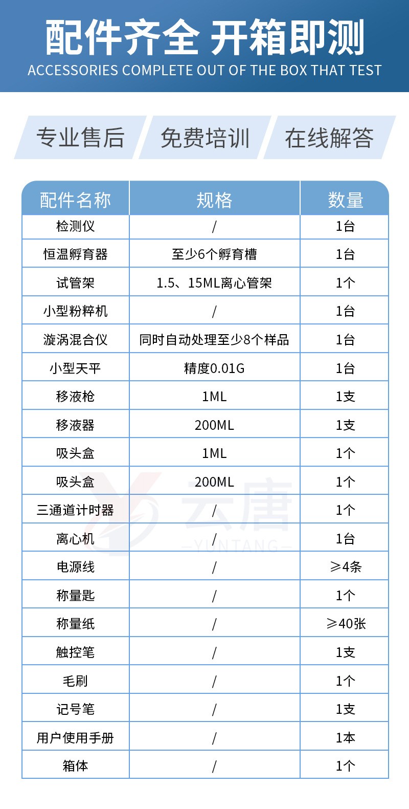 | 配件名称 | 检测仪 | 恒温孵育器 | 试管架 | 小型粉粹机 | 漩涡混合仪 | 小型天平 | 移液枪 | 移液器 | 吸头盒 | 吸头盒 | 三通道计时器 | 离心机 | 电源线 | 称量匙 | 称量纸 | 触控笔 | 毛刷 | 记号笔 | 用户使用手册 | 箱体 |
