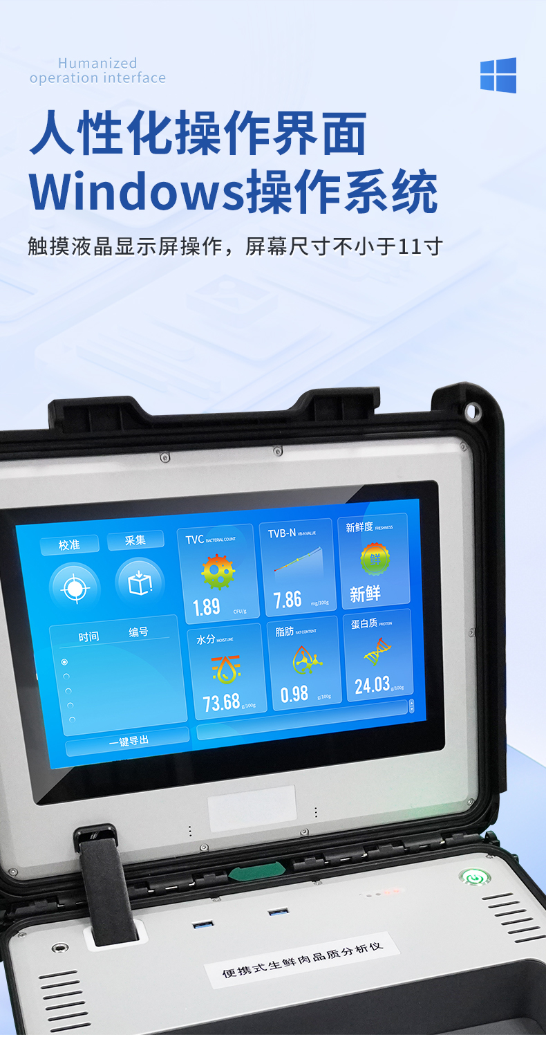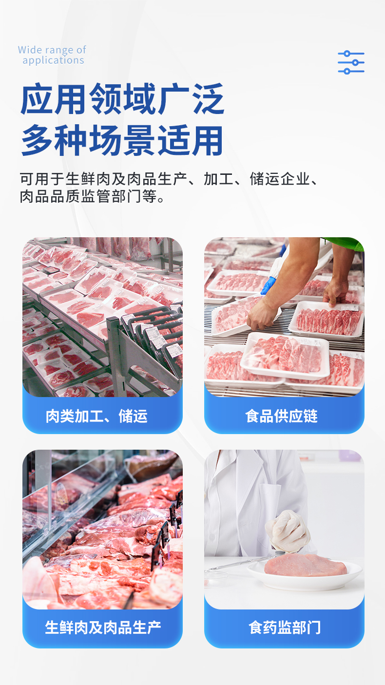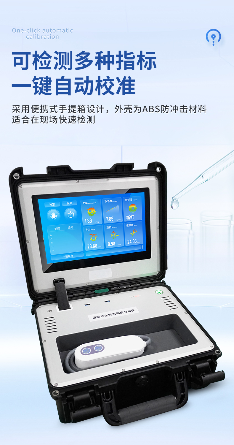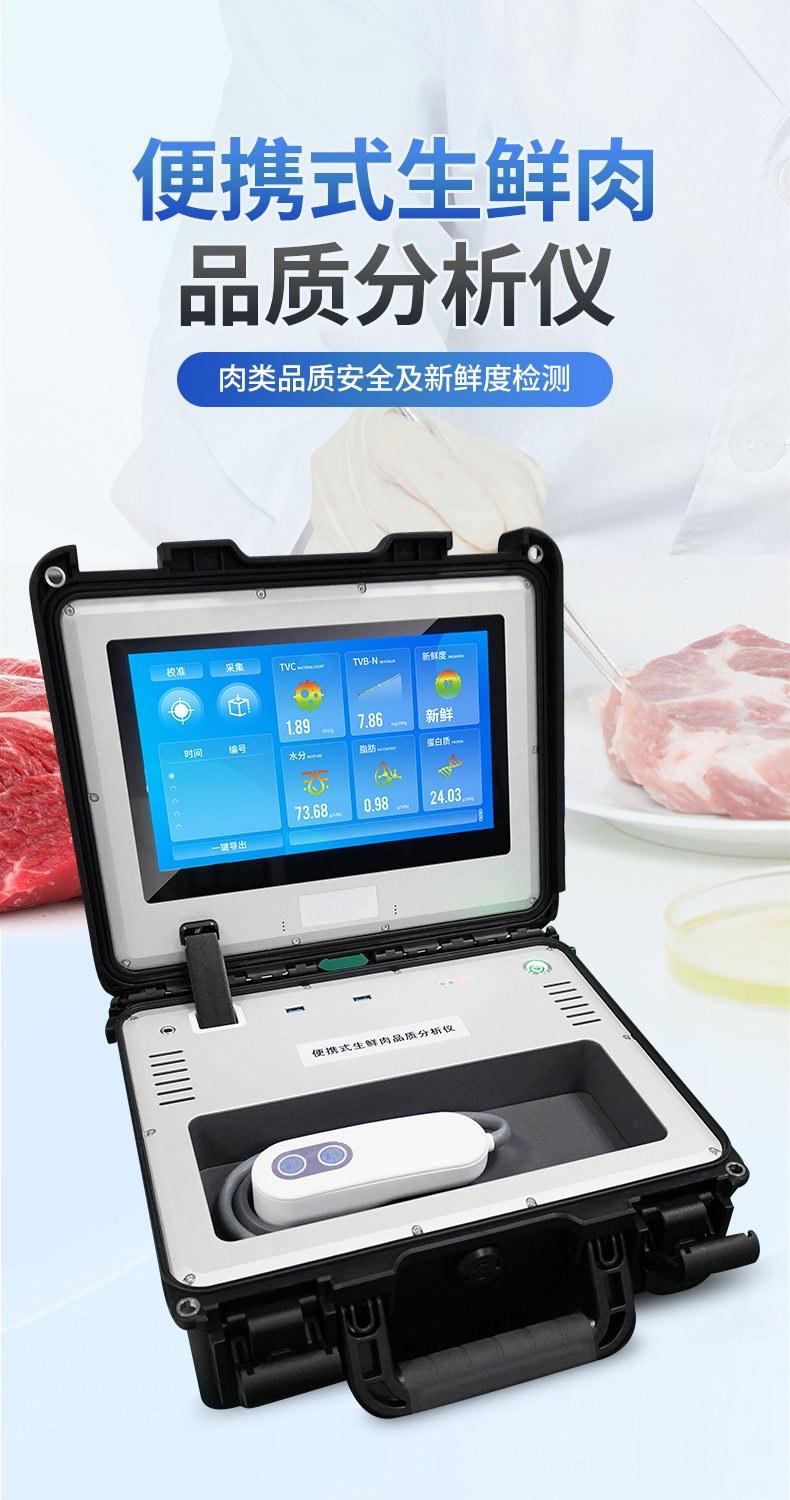 可用于检测生鲜肉的蛋白质、脂肪、水分、pH、TVC、TVB-N、新鲜度、L*、A*、B*等品质参数。配备手提箱式防水减震外壳、大尺寸触控屏幕并内置大容量电池,可一键自动校准,是一款适合移动作业场景的高精度生鲜肉品质检测仪,其可用于生鲜肉及肉品生产、加工、储运企业、肉品品质监管部门等。