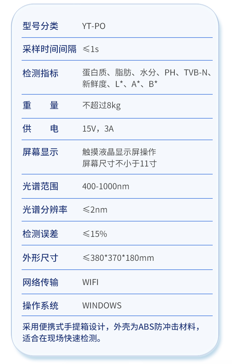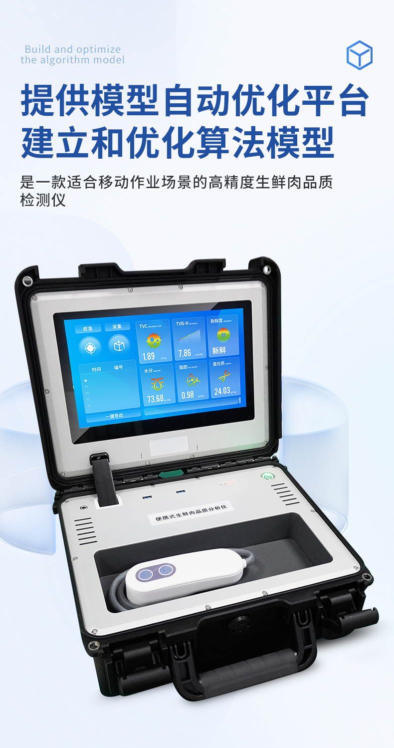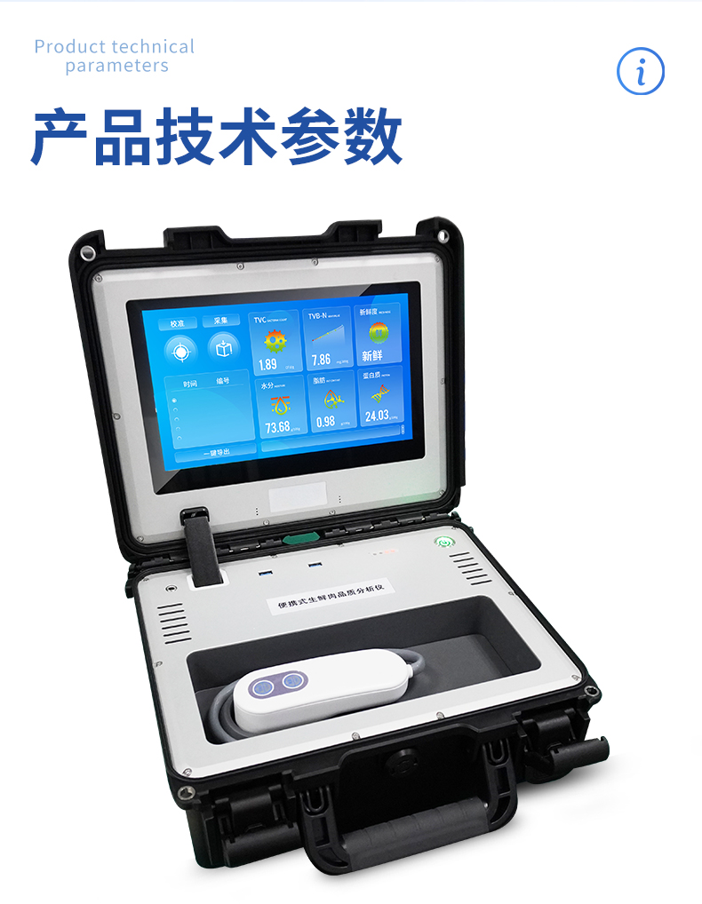| 1. ※检测指标:蛋白质、脂肪、水分、PH、TVB-N、新鲜度、L*、A*、B* | 2. 采样时间间隔:≤1s | 3. 重量:不超过8kg | 4. 供电:15V,3A | 5. 触摸液晶显示屏操作,屏幕尺寸不小于11寸 | 6. ※光谱范围:400-1000nm | 7. ※光谱分辨率:≤2nm | 8. 检测误差:≤15% | 9. ※提供模型自动优化平台,用户可通过设备建立和优化算法模型 | 10. 外形尺寸:≤380*370*180mm | 11. 网络传输:WIFI | 12. 操作系统:WINDOWS | 13. 采用便携式手提箱设计,外壳为ABS防冲击材料,适合在现场快速检测 |