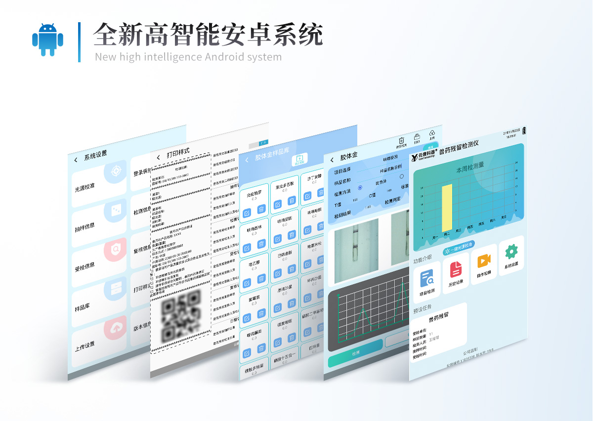 | 仪器采用10.1英寸液晶触摸屏显,搭配运行安卓智能操作系统,主控芯片采用ARM Cortex-A7,RK3288/4核处理器,主频1.88Ghz,运转速度更快速,性能更强。 | 仪器功能包括:胶体金检测??椤⑹只芾砟?椤⑽尴咄ㄑ赌?榈?,可以满足同一软件下实现所有检测项目的检测,并在同一窗口展示检测结果。 | 一体化便携式快检设备,采用交直流两用供电方式,可连接车载电源,配备6ah大容量充电锂电池,可以满足现场及流动检测使用的需求。仪器尺寸:43×35×20cm, 主机净重:5.1kg | 系统自带数据集成???,设备首页自动统计检测数据包含:周检测数据、月检测数据,全部检测总数量,均包含检测总数,合格数,不合格数,以及相关柱形分析图,对各项检测数据清晰掌握,无需电脑查询,更加快捷直观。 | 仪器具有任务预设???,可在样品送检前提前预设样品名称、检测指标、送检单位等信息,样品送检时一键调取保存信息,检测更加方便快捷。 | 轨道式自动传输扫描方式,可实时显示金标卡实时图像,系统自动分析并呈现出CT曲线图,CT线自动识别,无需手动调整,完成检测后自动退出检测卡。 | 结果判定线可修改,对照值标定值可保存,断电不丢失数据。 | 兼容市场上其他胶体金卡,使用耗材不受限制,极大增强用户使用体验。 | 仪器检测系统拥有庞大数据库,并且构建了完善的检索、修订功能。食品库涵盖多种样品名称,可按需添加或删除、编辑样品名称;产品数据库以及历史检测记录支持一键检索功能。 | 系统打印自定义化,打印格式多样化,产品合格证(****要求),二维码,抽样信息、检测信息,受检信息、复核信息、抽样日期、检测日期等信息结果,可按需求自行设置打印内容。 | A4纸版本报告打印功能(可选配):设备拥有两种结果展示方式,可以自动生成A4打印模板和小票打印模板两种样式,可通过WiFi及网线等方式链接外置打印机可进行打印 | 仪器具有 wifi 联网上传、RJ45网线连接功能,可以快速上传数据。同步对接监管平台,数据可局域网和互联网数据上传,检测结果直接传至食品安全监管平台。进行区域食品安全监管及大数据分析处理与数据统计,检测区域食品安全长短期动态,达到食品安全问题预估、预警。 | 设备支持U盘存储,标准USB接口,免驱动安装。检测结果存储容量20万条以上,可生成Excel表格,进行一键拷贝,并具有登录保护功能,可设置用户名及密码,规范不同人员操作权限,防止非工作人员操作,并且可以进行重新校准、锁定、恢复出厂设置功能。仪器固件可升级,后期检测项目可扩充。 | 仪器具备远程升级功能,可定向分客户分仪器更新,开机后自动更新,并可持续性免费更新系统版本,无需像传统产品返厂更新,节省时间及人力成本并避免了物流运输返厂升级导致设备损坏的潜在风险。 |