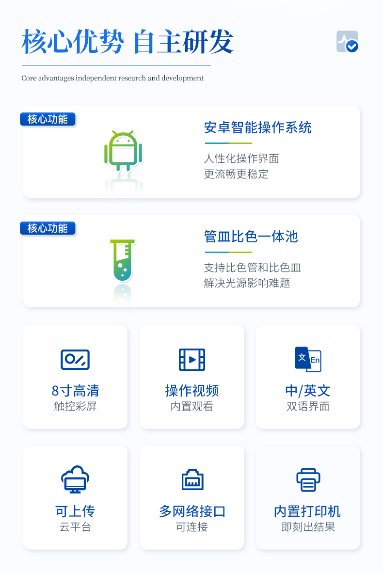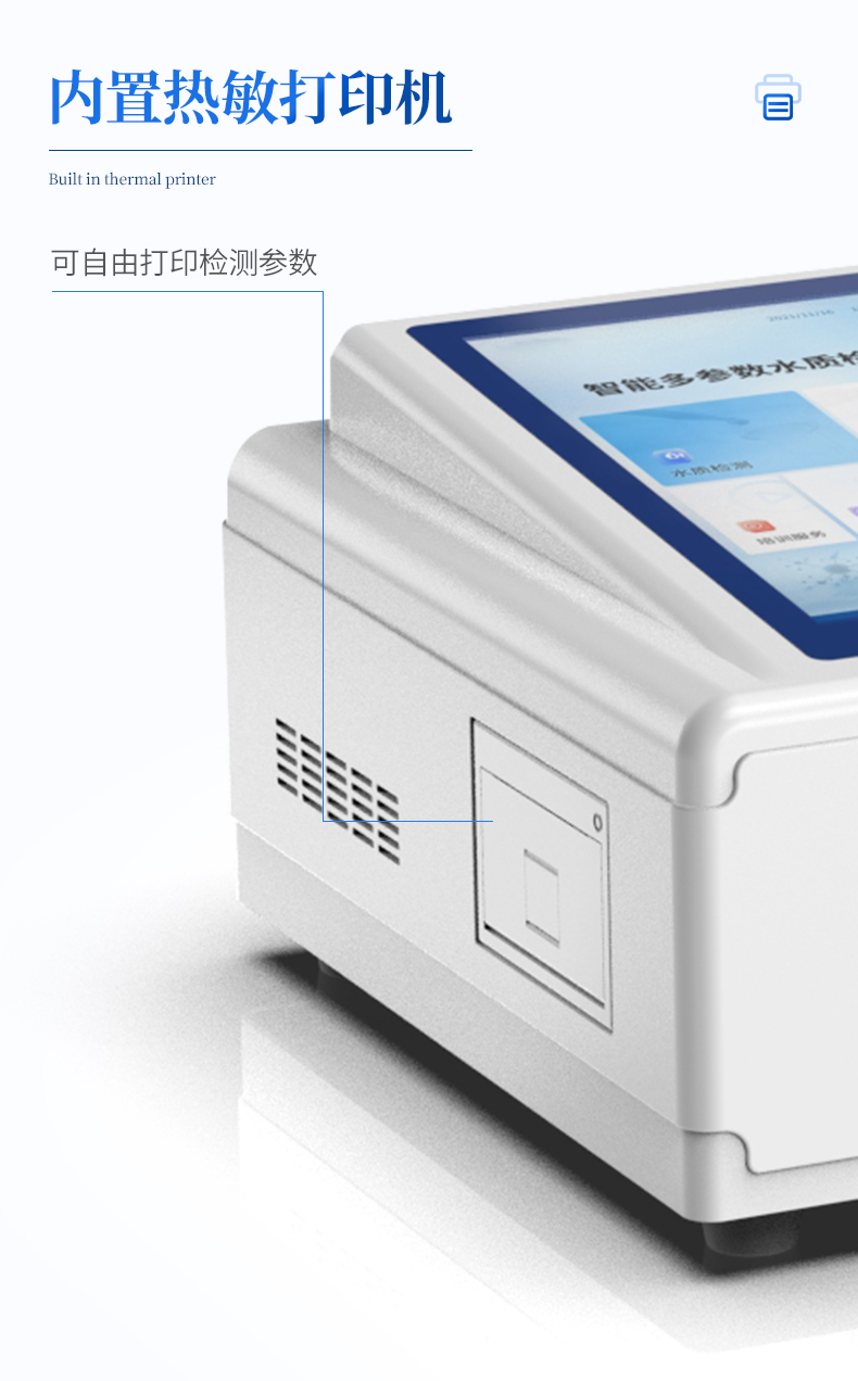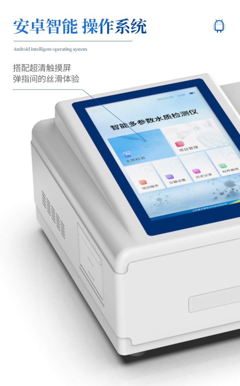 | 采用全新安卓7.1.1智能系统,人性化中文操作界面,运转速度更快速,稳定性更强。 | 8英寸液晶触摸屏显示,人性化中文操作界面,读数直观、简单。 | 采用精密比色池设计,使用光源一致,可以解决由于光源误差带来的检测结果误差问题,检测结果更加精准。 | 光源采用进口超高亮发光二极管,光源亮度可以自动调节与校准。 | 支持10mm、30mm、50mm皿比色和φ16mm管比色等比色方式,多元选择,确保测量的准确性; | 具有无线通讯功能,支持WIFI、RJ45、手机热点联网传输,检测数据亦可通过U盘导出; | 多功能样品管理,可对样品进行中英文命名,方便样品记录和数据存储; | 仪器可永久存储800万组数据,为方便大量数据查找,可通过时间检索,并随意选择分析; | 支持HDMI输出,方便用户培训、讲解、及大屏展示。 | 仪器带有监管云平台,数据可通过局域网和互联网上传,亦可对接上传至环境监管部门平台。 | 内置热敏行式打印机,打印纸上的内容可自由选择(包括二维码打?。?; | 交流220V,可选配6ah大容量充电锂电池,方便户外流动测试; | 后期产品固件可升级。 |
