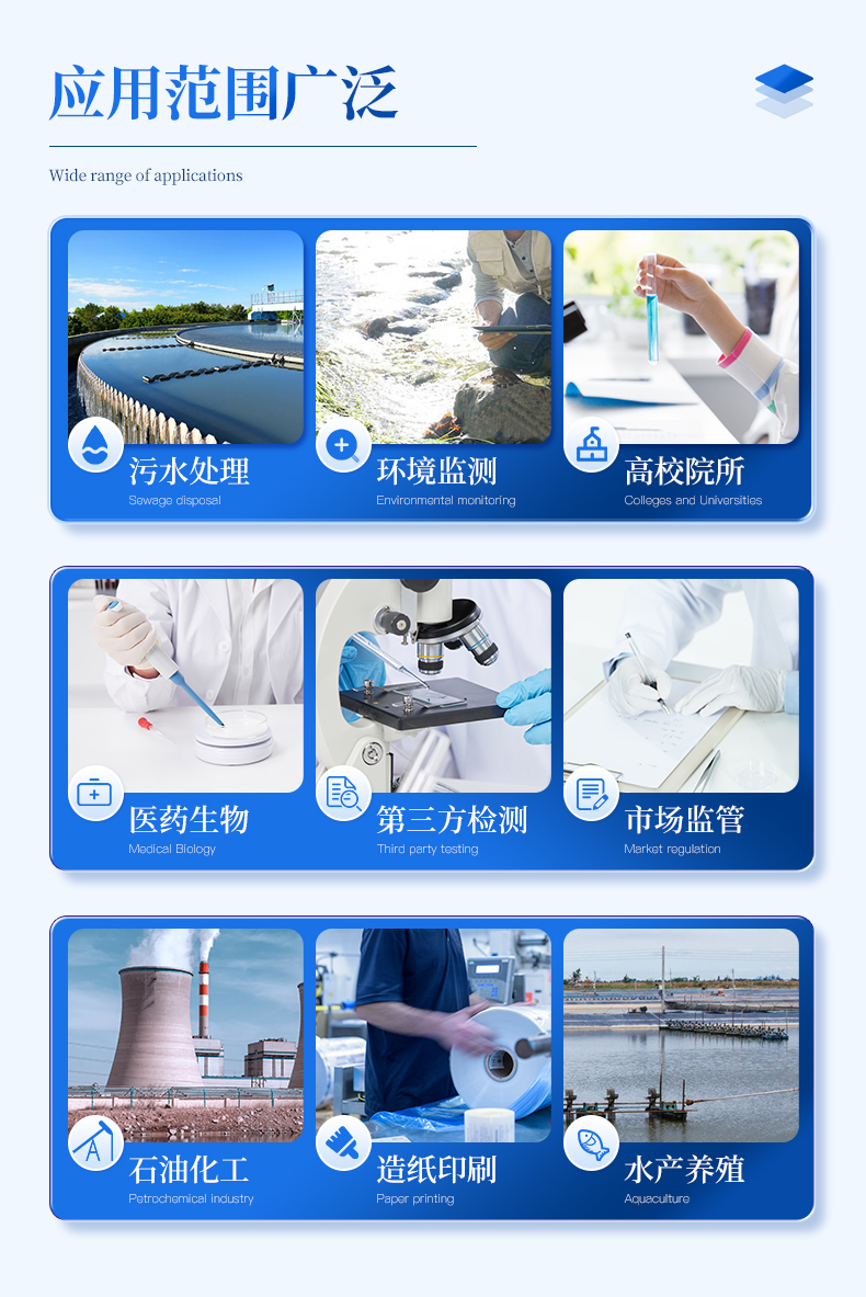 COD氨氮总磷快速检测仪能够广泛的应用于各种行业(工业废水、城市污水、生活污水及江湖流域地表水)废水的检测,可适合不同用户的多种需求,可在化工、石油、焦化、造纸、冶金、酿造、医药等工业废水及各种生活污水监测应用。