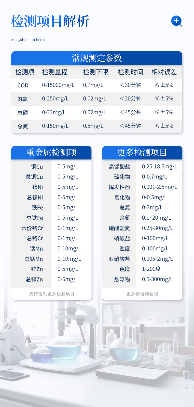 | 波长配置:420nm、470nm、520nm、560nm、620nm、700nm; | 示值误差:≤±5%; | 仪器稳定性:<0.5%; | 仪器重复性:<0.5% | 光化学稳定性:20min内数值漂移≤0.002A(10万小时寿命); | 1、COD 依据标准:HJ/T399-2007水质化学需氧量快速检测法 检测量程:0-15000mg/L(分段) 检测下限:0.7mg/L | 2、氨氮 依据标准:HJ535-2009水质氨氮的测定纳什试剂分光光度法 检测量程:0-250mg/L(分段) 检测量程:0-250mg/L(分段) | 3、总磷 依据标准:GB11893-89水质总磷的测定钼酸铵分光光度法 检测量程:0-33mg/L(分段) 检测下限:0.02mg/L |