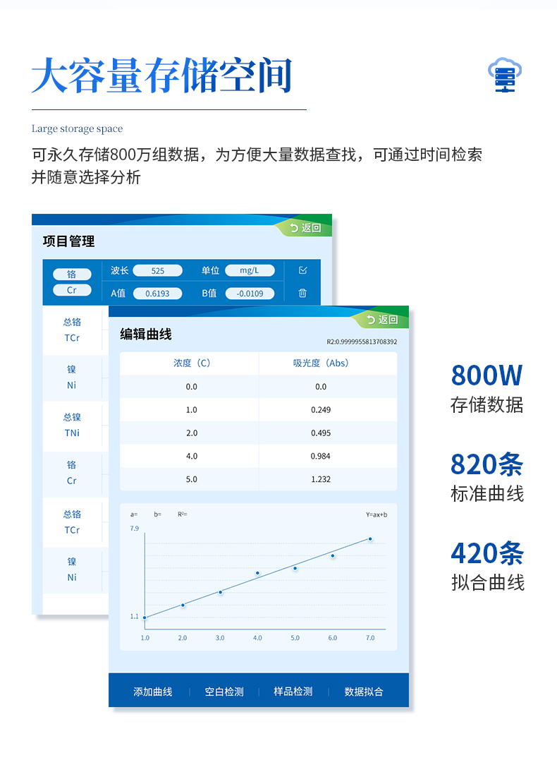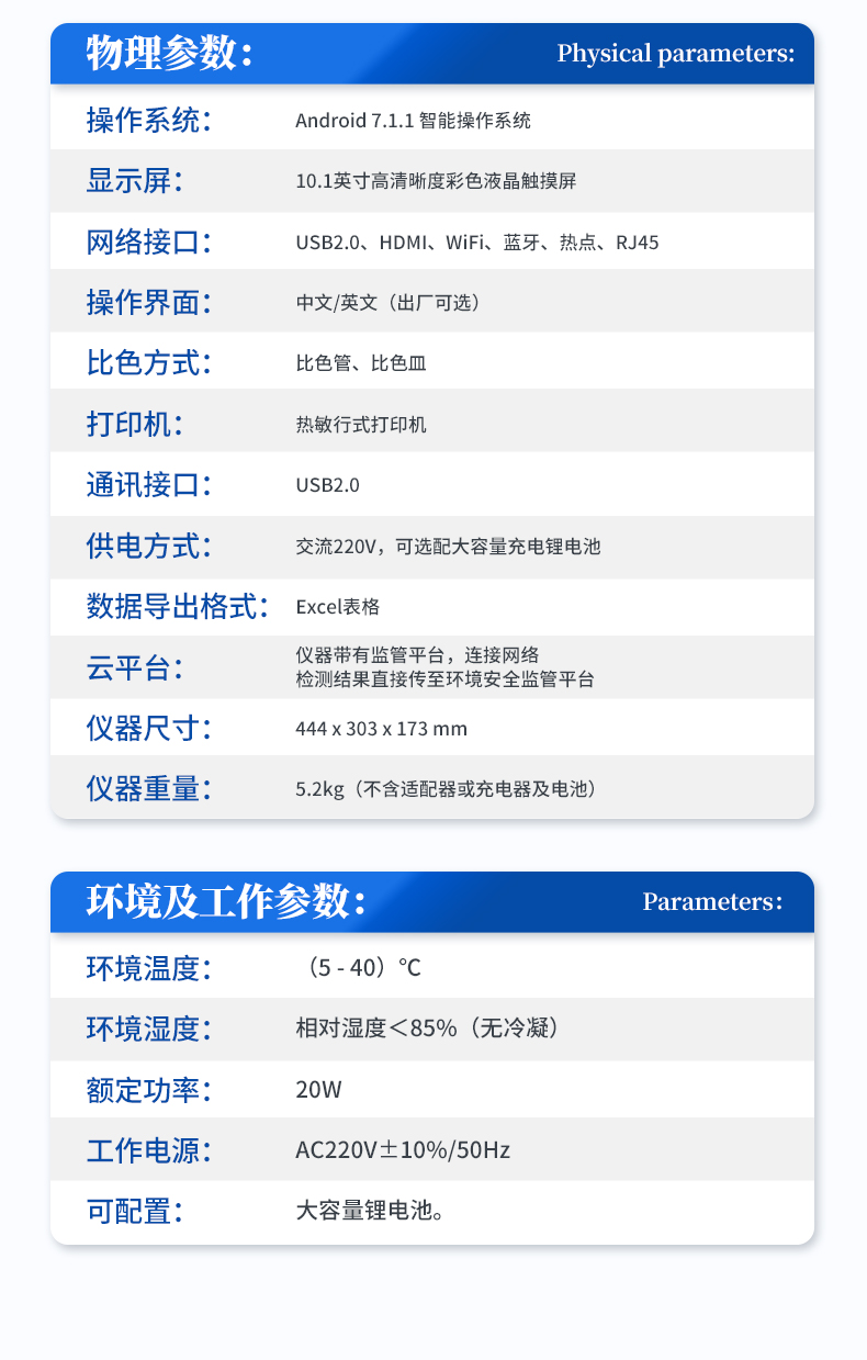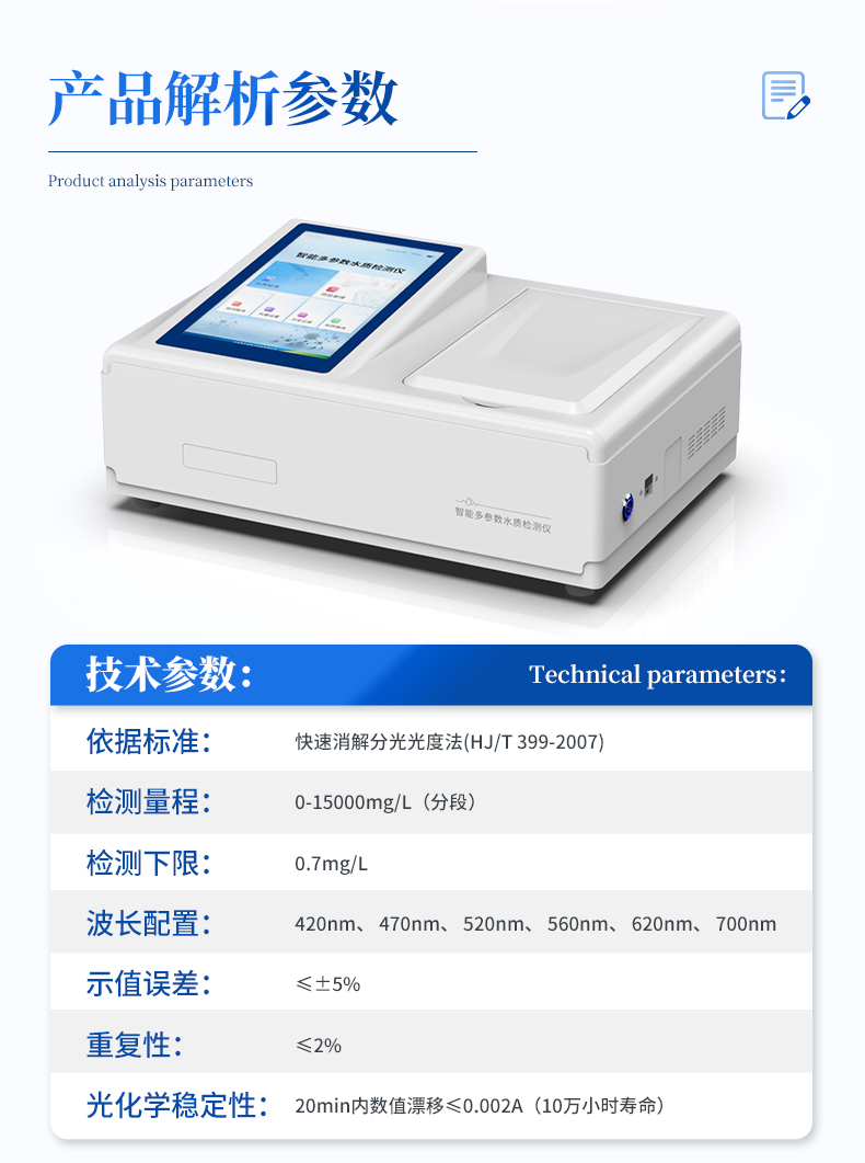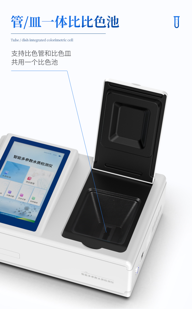 | 比色方式:比色管(16mm消解比色一体管)、比色皿(10mm、30mm、50mm); | 操作系统:Android7.1.1智能操作系统 | 操作界面:中文或英文操作界面; | 显示屏:8英寸(1024*768分辨率)高清晰度彩色液晶触摸屏; | 曲线数量:820条标准曲线、420条拟合曲线 | 网络接口:USB2.0、HDMI、WiFi、蓝牙、热点、RJ45; | 云平台:仪器带有监管平台,连接有线/无线网络,检测结果直接传输至环境安全监管平台。 | 打印机:热敏行式打印机; | 数据储存:800万组,可自由调用查看; | 数据导出格式:Excel表格; | 仪器尺寸:367x243x125mm; | 仪器重量:5.3kg; |