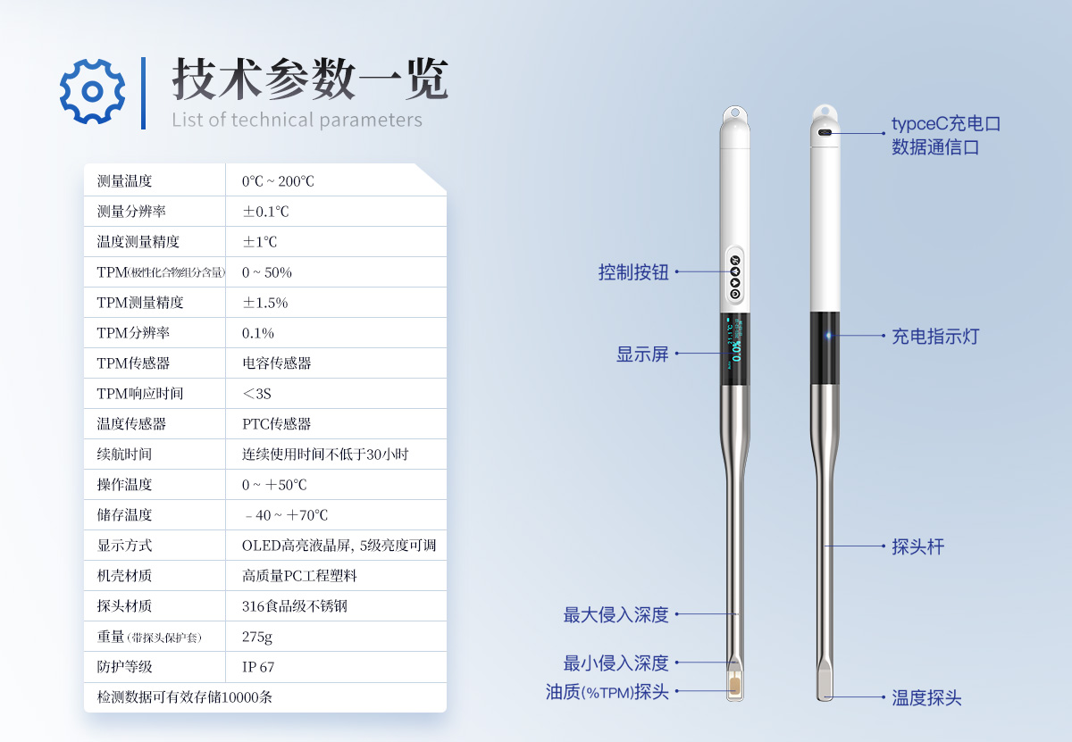 | 测量温度:0℃~200 ℃ | 温度分辨率:± 0.1℃ | 温度测量精度:± 1.5℃ | TPM(极性化合物组分含量):0~50% | TPM测量精度:± 1.5% | TPM分辨率:0.1% | 温度传感器:PTC传感器 | TPM传感器:电容传感器 | TPM响应时间:<3s<> | 油品质提示:高低频率闪烁提示 | 操作温度:0 ~+50 ℃ | 存储温度:-40 ~+70 ℃ | 显示方式:OLED高亮液晶屏,5级亮度可调。 | 机壳材质:高质量PC工程塑料 | 探头材质:316食品级不锈钢 | 防护等级:IP 67 | 续航时间:连续使用时间不低于30小时 | 检测数据:可有效存储10000条 | 重量:275g |