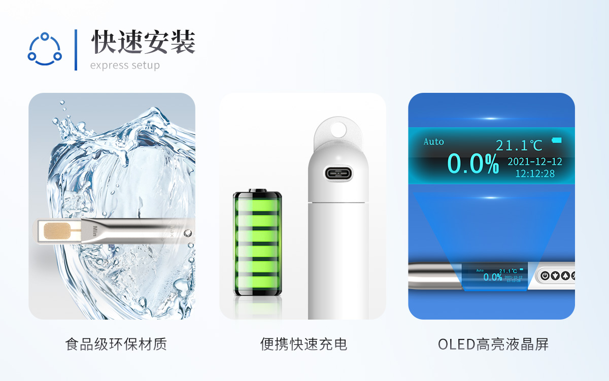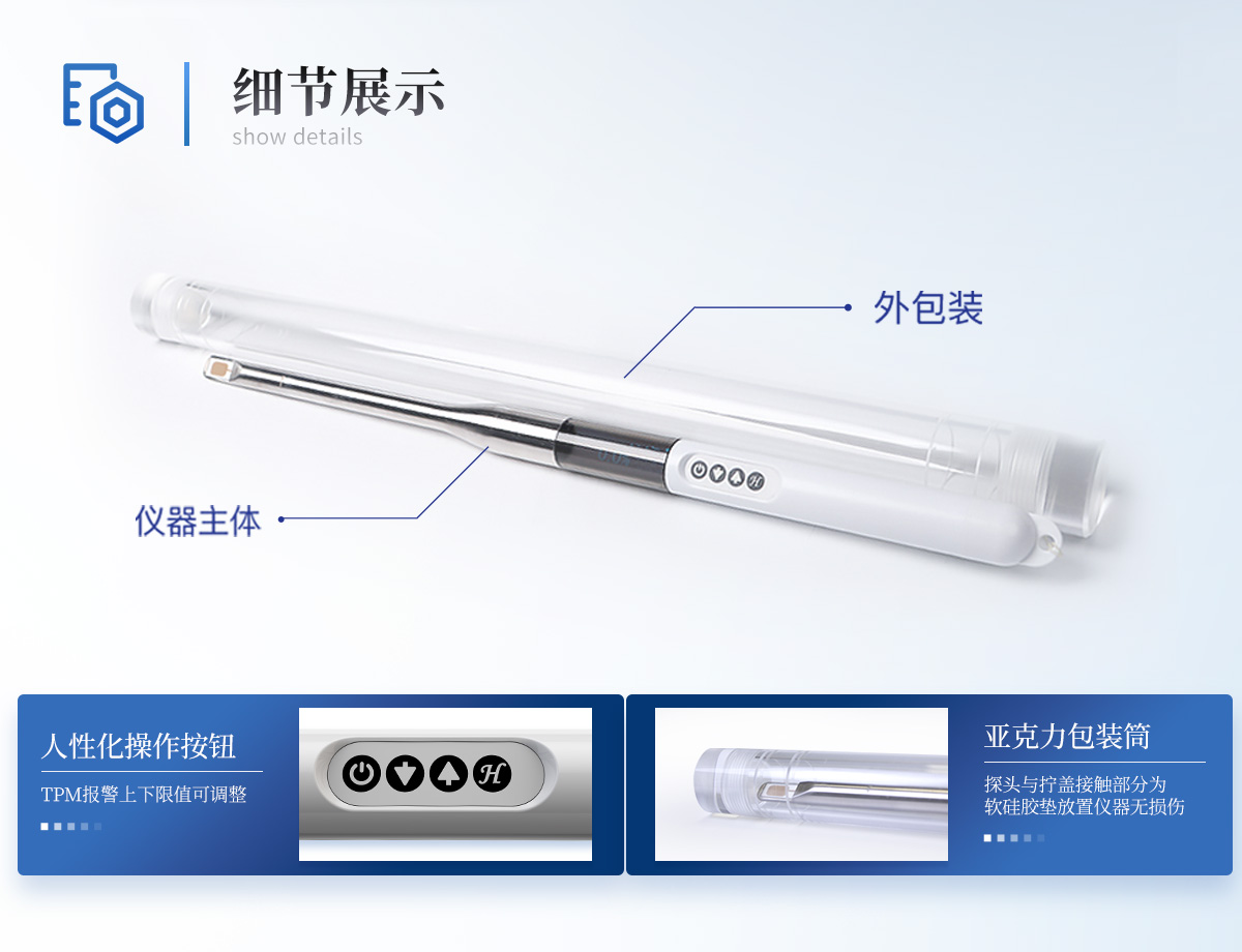 | ■操作便捷,现场检验,可在各种使用环境下测量。 | ■快速测量 3秒钟能得到测量结果,并有不同区间品质的闪烁提示。 | ■没有二次污染 探头所选材质均为食品级环保材质,不会产生二次污染。 | ■防水设计 仪器设计采用IP67防护等级。 | ■便携性采用900mAh锂离子充电电池,经济环保耐用,TYPE-C充电口快速便捷。 | ■外形采用流线型设计,符合人体工程学,方便手握。 | ■探头外形采用梭形流线型设计,减少测试完成后存液挂液,同时利于擦拭清洗。 | ■可调整TPM报警上下限值。 | ■具备校正仪器TPM参数功能。 | ■仪器可连接wifi无线上传数据,也可以上位机上传本地。 | ■标配云端管理平台,可对数据进行历史管理分析评价,也可上传第三方平台。 | ■可恢复出厂设置。 | ■具备保持测试数据功能。 |