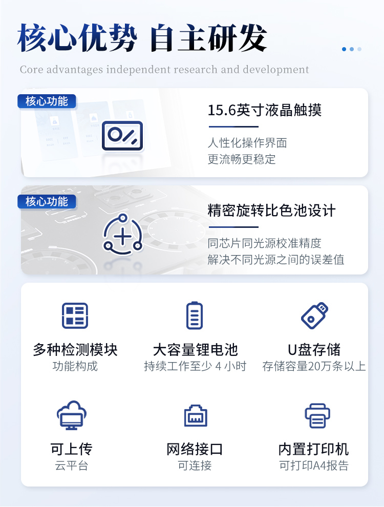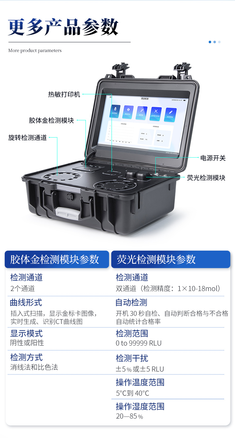 | 1. 功能构成:主要包括分光光度???、新型农残检测模块、胶体金检测???、荧光检测??椤⑹只芾砟?榈龋心?榧梢惶?,可快速检测200多种食品安全项目,如兽药残留、农药残留、非法添加剂、细菌数值等指标。 | 2. 检测样品种类:餐具及厨房用品、瓜果蔬菜及其制品、水产品及其制品、畜禽产品及其制品、婴幼儿乳品及奶粉制品、蜂蜜、粮油及其制品、调味品(食醋、酱油、味精、盐等)、酒类茶叶及其制品、食用菌、饮料、蛋类药物残留(鸡蛋,鸭蛋等)、米豆面制品、糖果糕点类(小食品)、薯类及膨化食品、瓶(桶)装饮用水、添加食用色素的食品、使用添加剂的食品、含有有毒有害物质的相关食品。 | 3、显示屏幕:仪器采用15.6英寸液晶触摸屏显,搭配运行安卓智能操作系统,主控芯片采用ARM Cortex-A7,RK3288/4核处理器,主频1.88Ghz,操作方便,性能更强。 | 4、供电模式:仪器交直流两用,直流12V供电,可连接车载电源,配18ah大容量充电锂电池,电量可实时显示,无外部电源条件下可持续工作至少 4 小时。 | 5、检测通道:≥24通道;采用精密旋转比色池设计,使用同芯片同光源校准精度,解决不同光源之间的误差值,更加准确**,采用高精度进口四波长冷光源,每个通道均配置 410、520、590、630nm 波长光源,标配**的光路切换装置,专利光路切换功能可实现64波长,并且所有检测项目可实现所有通道同时检测. | 6、通讯接口:配备无线通信??椤?G(APN)通讯???、蓝牙传输,同时具有双USB接口以及RJ45网线接口,可以多方式实现数据保存及数据传输。 | 7、存储方式:支持U盘存储,两个标准USB接口,免驱动安装。检测结果存储容量20万条以上,可生成Excel表格进行拷贝,并具有登录?;すδ?。 | 8、操作系统:仪器可在同一检测界面自动对应相关检测通道,一次性选择不少于11个样品名称,无需退出界面,节省操作时间。并可以对每个通道属性和样品信息单独进行编辑,例如送检单位、人员,检测人员等,打印时勾选打印显示。 | 9、数据集成系统:设备首页自动汇总分析检测数据,包含:周检测数据、月检测数据,全部检测总数量,包含检测总数,合格数,不合格数,以及相关柱形分析图,各项检测数据一目了然,无需电脑查询,更加快捷直观。 | 10、数据库系统:十几项数据库分类管理仪器:包含项目类型、项目数据、检测数据、历史记录、国标信息、曲线信息、采样信息、检测信息、受检信息、复核信息、图表信息、光源校准信息、打印样式信息、样品库信息等等,数据库之间互相协调联动保证数据的真实完整性。同时产品数据库以及历史检测记录支持一键检索功能。 | 11、限量规判系统:具有限量查询、添加物质合规判定系统。检测出结果后,系统自动调用系统数据库中相关国标进行比对判定,客观显示判定结果是否合格。 | 12、项目预设系统:仪器具有任务预设??椋患崆霸ど?,给出方便快捷的新检测方案,每一个任务分别可以设置不同的样品、批次、编号、来源、备注、抽样信息、检测信息、受检信息、复核信息等更多信息。样品送检时一键调取保存信息,并可多次调取,适用于大批量检测业务,可以大大提高检测效率。 | 13、数据监管系统:同步对接监管平台,数据可局域网和互联网数据上传,检测结果可直接传至食品安全监管平台。进行区域食品安全监管及大数据分析处理与数据统计,监测区域食品安全长短期动态及问题预估、预警。 | 14.1、全新打印系统:内置全新打印机,新创自定义打印方式,可按需灵活勾选控制:产品合格证(国家农业部标准要求),二维码,抽样信息、检测信息,受检信息、复核信息、抽样日期、检测日期等信息的打印。 | 14.2、A4纸版本报告打印功能:设备拥有两种结果展示方式,可以自动生成A4打印模板和小票打印模板两种样式,可通过WiFi及网线等方式连接外置打印机可进行打印。 | 15、胶体金检测模块:采用单通道CMOS成像处理技术及胶体金免疫层析技术,可读取胶体金卡数据,自动采集、处理分析,将检测结果显示,并可根据参考限值自动判断检测结果,可检测常见的兽药残留、生物毒素、抗生素、违禁添加物等。 | 15.1、可即时检测单联卡及三联卡; | 15.2、检测通道:2个通道; | 15.3、检测方式:消线法和比色法; | 15.4、显示模式:阴性或阳性; | 15.5、曲线形式:插入式扫描方式,显示金标卡图像,实时生成、识别CT曲线图,无需手动调整。兼容市场上其他金标卡,使用耗材不受限制。 | 16、荧光检测??椋嚎焖偌觳馑手形⑸?、固体物细菌含量。利用“荧光素酶—荧光素体系”快速检测三磷酸腺苷(ATP)。以ATP含量表明样品中微生物与其他生物残余得多少,用于判断卫生状况。 适用于食品、餐具、手、液体等表面及水质洁净度的检测。 | 16.1、检测通道:双通道 检测精度:********** | 16.2、检测范围:0 to 99999 RLU | 16.3、检测时间:15 秒 | 16.4、检测干扰:±5﹪或±5 RLU | 16.5、操作温度范围:5℃到 40℃ | 16.6、操作湿度范围:20—85﹪ | 16.7、开机 30 秒自检、内置自校光源、自动判断合格与不合格、自动统计合格率 。 | 17、仪器具备远程升级功能,可定向分客户分仪器更新,开机后自动更新,并可持续性免费更新系统版本,无需像传统产品返厂更新,节省时间及人力成本并避免了物流运输返厂升级导致设备损坏的潜在风险。 |