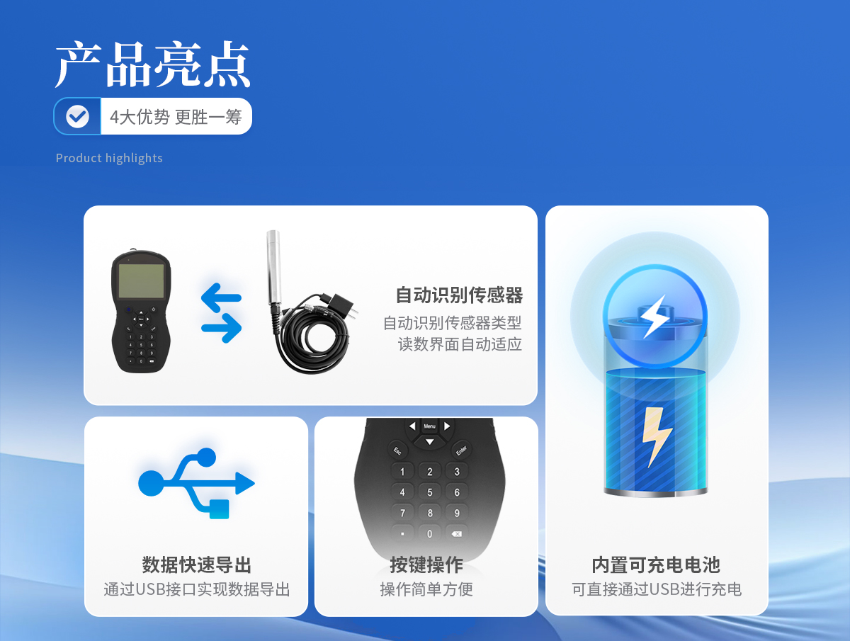 | ? 主机具有IP67防护等级; | ? 3.5寸彩屏显示,界面菜单设计美观,操作简单方便; | ? 人体工程学曲线设计,适于手握握持,带有橡胶防滑手带,在潮湿环境中不易滑落; | ? 具有数据存储功能,且可通过USB接口实现数据导出; | ? 内置可充电电池,且直接通过USB进行充电,无需拆卸电池; | ? 自动识别连接的传感器类型,读数界面自动适应; | ? 可对传感器进行参数设置和校准; |