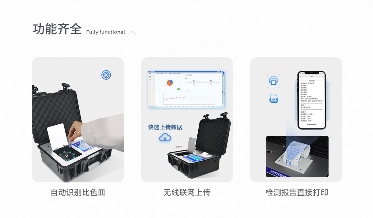 | 安卓智能操作系统,采用更加**和人性化操作,仪器具有无线联网上传功能,快速上传数据,进行数据统计和分析。 | 智能化程度高,仪器具有自检功能:具有开机自检和调零功能,具有自动检测重复性功能;同时,检测完成可自动打印检测报告和二维码。手机扫码可显示出详细检测信息。 | 仪器带有监管平台,数据可局域网和互联网数据上传,检测结果直接传至食品安全监管平台。进行区域食品安全监管及大数据分析处理与数据统计,检测区域食品安全长短期动态,达到食品安全问题预估、预警 。 | 样品处理简单省力,整体操作快速、安全、便捷。 | 仪器具有自身保护功能,可设置用户名及密码,防止非工作人员操作等。 | 内置强大的数据库,可在仪器上直接选择样品名称、检测指标、送检单位等信息,也可在仪器上直接编辑录入样品名称、检测指标、送检单位等信息并保存进样品数据库,方便后期操作调取使用。 | 仪器具有重新校准、锁定、恢复出厂设置功能。 |
