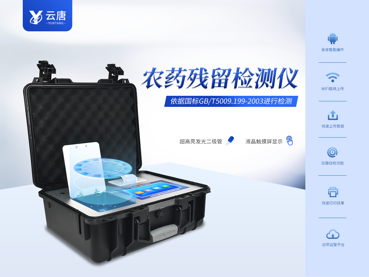 山东云唐智能科技有限公司生产的农药残留检测仪广泛应用于主要用于蔬菜、水果、茶叶、粮食、农副产品等食品中农药残留的快速检测,依据国标GB/T5009.199-2003进行检测,适用于果蔬茶生产基地以及农贸批发销售市场现场检测,餐馆、学校、食堂、家庭果蔬加工前的安全速测等。