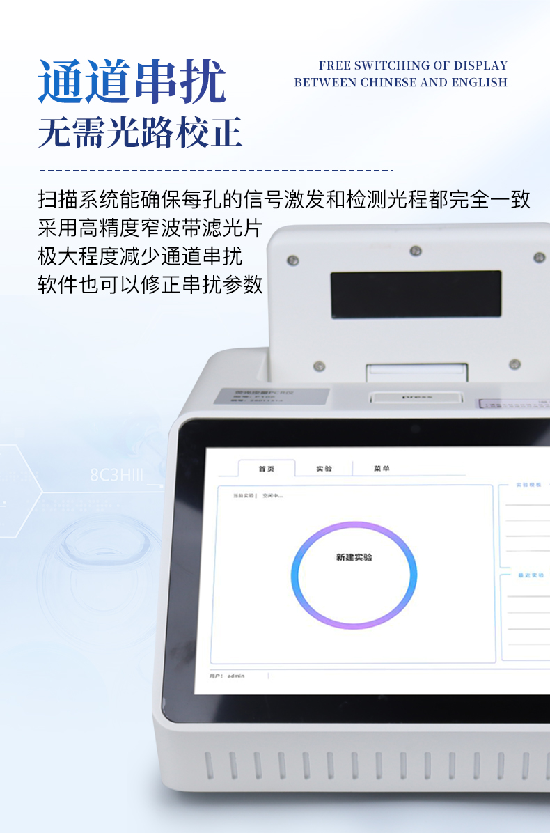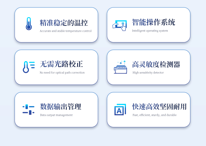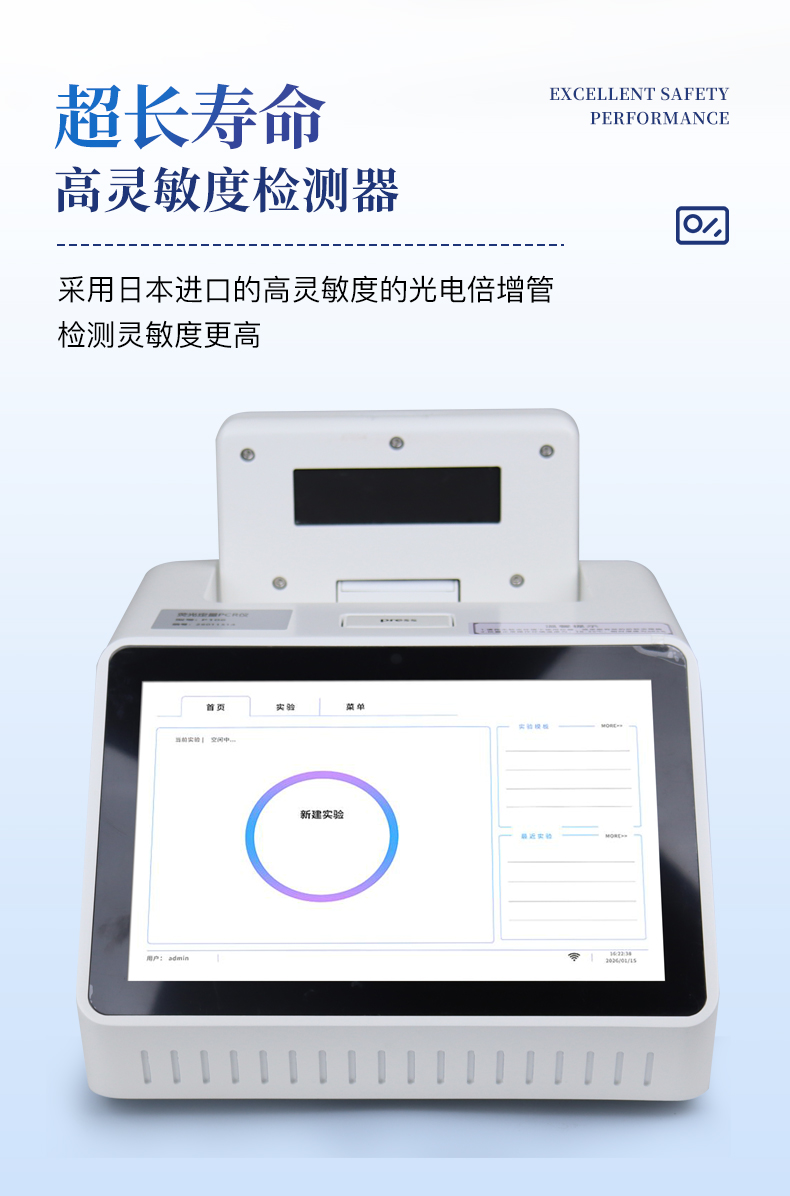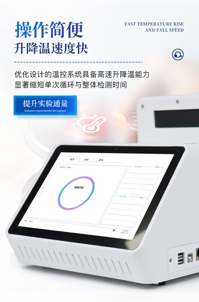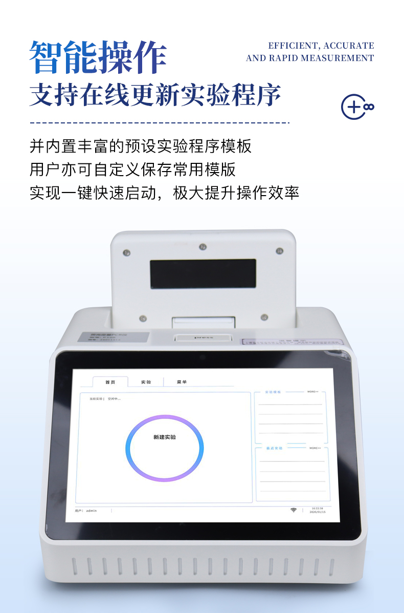 | 1.智能操作系统,实验尽在掌握 | A双模式灵活控制:支持通过仪器触摸屏独立运行,也支持通过电脑软件进行远程控制与数据管理,适应不同实验场景需求。 | B程序更新与预设:支持在线更新实验程序,并内置丰富的预设实验程序模板,用户亦可自定义保存常用模版,实现一键快速启动,极大提升操作效率。 | C极简启动体验(可选配):可定制集成摄像头扫描系统,用户只需扫描样品板或程序卡的二维码,即可自动识别并调用对应实验程序,简化流程,避免人为设置错误。 | D操作简单:无论是触摸屏界面还是电脑软件,均设计得直观易懂,新用户也能快速上手。预置常用程序模板,进一步简化操作流程。 | 2.精准稳定的温控与光学核心 | A长久精准的温控系统:采用进口***TEC半导体制冷??椋匚戮迹ā?.1°C),孔间温度均匀性**(≤±0.3°C)。系统稳定性卓越,长期使用性能衰减小,校准周期长达数年,显著降低维护成本与运营中断。 | B免维护的灵敏光学系统:配备4个独立LED光源与4个独立光电二极管检测器,实现四通道荧光同步精准检测。采用超长寿命进口光源,设计寿命期内免维护,无需额外校准或更换,保障检测结果长期一致性与高灵敏度。 | C卓越的数据质量:实验线性相关性高(R2≥0.999),重复性优异(孔间CV值低),确保定量结果准确可靠,数据置信度高 | 3.**便捷的数据与输出管理 | A多重数据导出方式:支持通过USB存储设备直接拷贝,或经由Wi-Fi无线网络传输数据至本地服务器或云端,方便灵活,满足各类实验室数据管理习惯。 | B丰富的报告导出与打?。褐С稚刹⒌汲龆嘀指袷剑ㄈ鏟DF、Excel)的实验报告。仪器兼容USB热敏打印机、蓝牙无线打印机及常规A4打印机,可直接在仪器上或通过电脑一键导出并打印专业报告,便于结果存档与即时分享。 | 4.快速**与坚固耐用 | A升降温速度快:优化设计的温控系统具备高速升降温能力,显著缩短单次循环与整体检测时间,提升实验通量。 | B超长使用寿命:核心部件均选用工业级耐用材料与设计,整机运行稳定可靠,致力于为用户提供长久的投资回报。 |