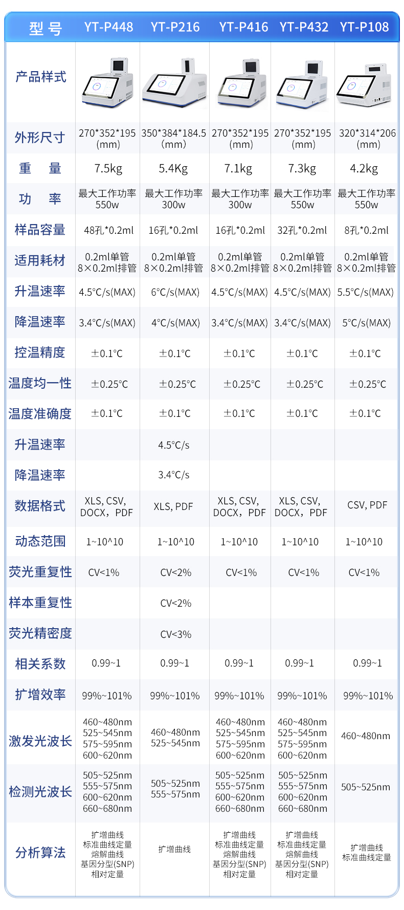 | 基本性能 | 外形尺寸:270*352*195 (mm) | 重量:7.3kg | 电源:220V | 功率:**工作功率550w | 操作系统:自带Android操作系统 | 外接电脑:外接windows电脑(win7系统以上) | 系统语言:中英文实时切换 | 通信接口:方形USB | 操作环境参数 | 操作环境温度:18~35℃ | 操作环境相对湿度:0%~85% | 运输及储存温度:-20~55℃ | 运输及储存相对湿度:0%~85% | 系统性能 | 样品容量:32孔*0.2ml | 样品容积:15~100ul | 适用耗材:0.2ml单管、8×0.2ml排管 | 控温范围:4~99℃ | 热盖温度:30℃-108℃(默认105℃,热盖温度可调) | 温控方式:高性能进口半导体 | 梯度控温:3??樘荻瓤匚拢?*温差支持35℃ | 升温速率:4.5℃/s(MAX) | 降温速率:3.4℃/s(MAX) | 控温精度:±0.1℃ | 温度均一性 :±0.25℃ | 温度准确度 :±0.1℃ | 操作功能:预设项目和分析参数,操作简单方便 | 报告:支持报告自定义???,32孔分项目打印 | 分析功能:具多重qPCR数据分析功能,可同时检测4个检测通道 | 断电?;?可以一键重启中断的实验 | 仪器信息:拥有故障记录,分析,提示的功能,更方便远程解决问题 | 分析算法:扩增曲线,标准曲线定量、熔解曲线,基因分型(SNP),相对定量 | 支持HRM检测:支持 | 数据导出:可将实验结果以图形和表格的形式直接导出;详细的数据报告内容包括实验条件,数据坐标和表格,数据分析参数。 | 数据格式:XLS, CSV, DOCX,PDF | TouchDown功能:支持时间和温度递增递减模式 | 荧光检测系统性能 | 检测灵敏度:可检测单拷贝基因 | 动态范围:1~10^10 | 荧光重复性:CV<1%(使用某品牌试剂做32孔均一性实验,32个孔的ct差值保持在0.5以内,cv保持在1%以内。)<> | 相关系数:0.99~1(每种浓度3个重复,梯度曲线的相关系数>0.99,扩增效率保持在99%~101%之间) | 扩增效率:99%~101% | 可信度:区分1000与2000拷贝浓度差异 | 激光光源:大功率LED(免维护,寿命长) | 检测器:高灵敏度光电传感器 | 激发和检测传播介质:耐高温专业导光光纤 | 激发光波长:460nm~480nm , 525nm~545nm, 575nm~595nm ,600nm~620nm | 检测光波长:505nm~525nm , 555nm~575nm , 600nm~620nm , 660nm~680nm |