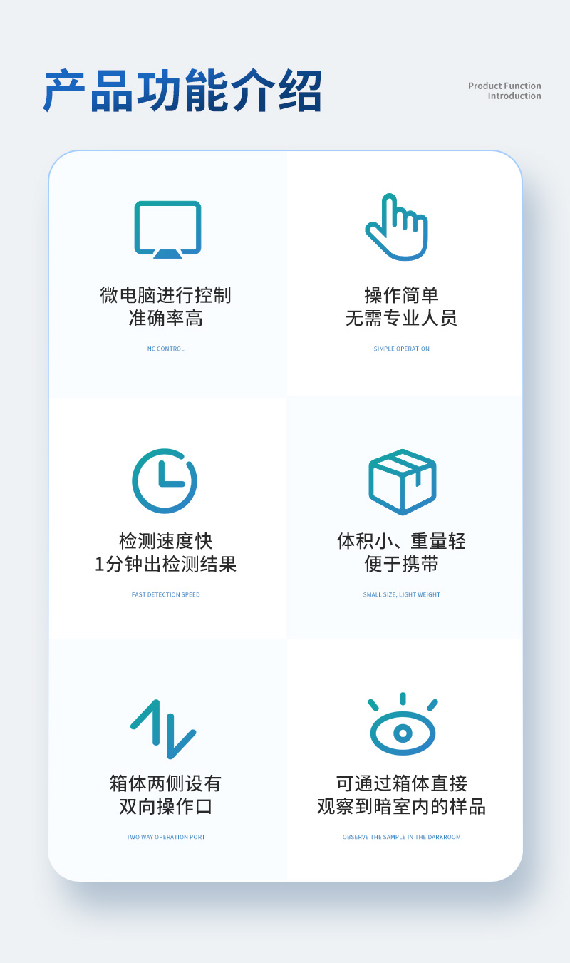 | ★1、采用微电脑进行控制,准确率高 | ★2、操作简单,无需专业人员 | ★3、检测速度快,1分钟出检测结果 | ★4、体积小、重量轻、便于携带 |