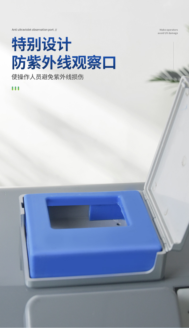 | ★依据行标:NY/T1257-2006 | ★仪器箱体两侧设有双向操作口,前开门设计,方便取放样品。 | ★用户可通过箱体直接观察到暗室内的样品。 | ★特别设计防紫外线观察口,使操作人员避免紫外线损伤。 | ★紫外短波波长:254nm | ★紫外长波波长:365nm | ★可见光源 | ★紫外滤色片尺寸:200×50mm | ★工作电源: 220V交流电源 | ★使用温度: 0℃-40℃ | ★使用湿度: <90% (40℃) | ★仪器功耗: 20W | ★外型尺寸:300×200×290mm |