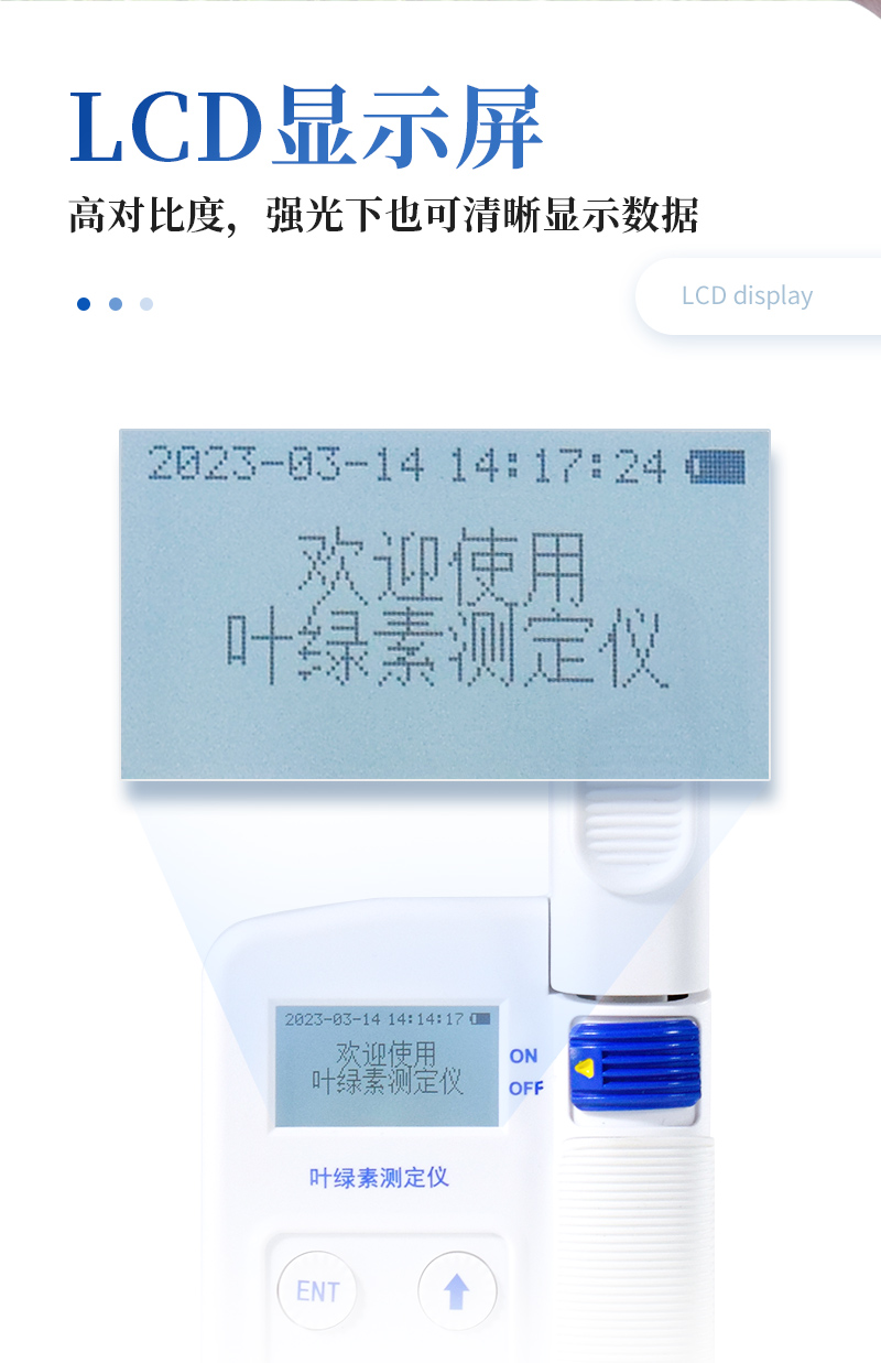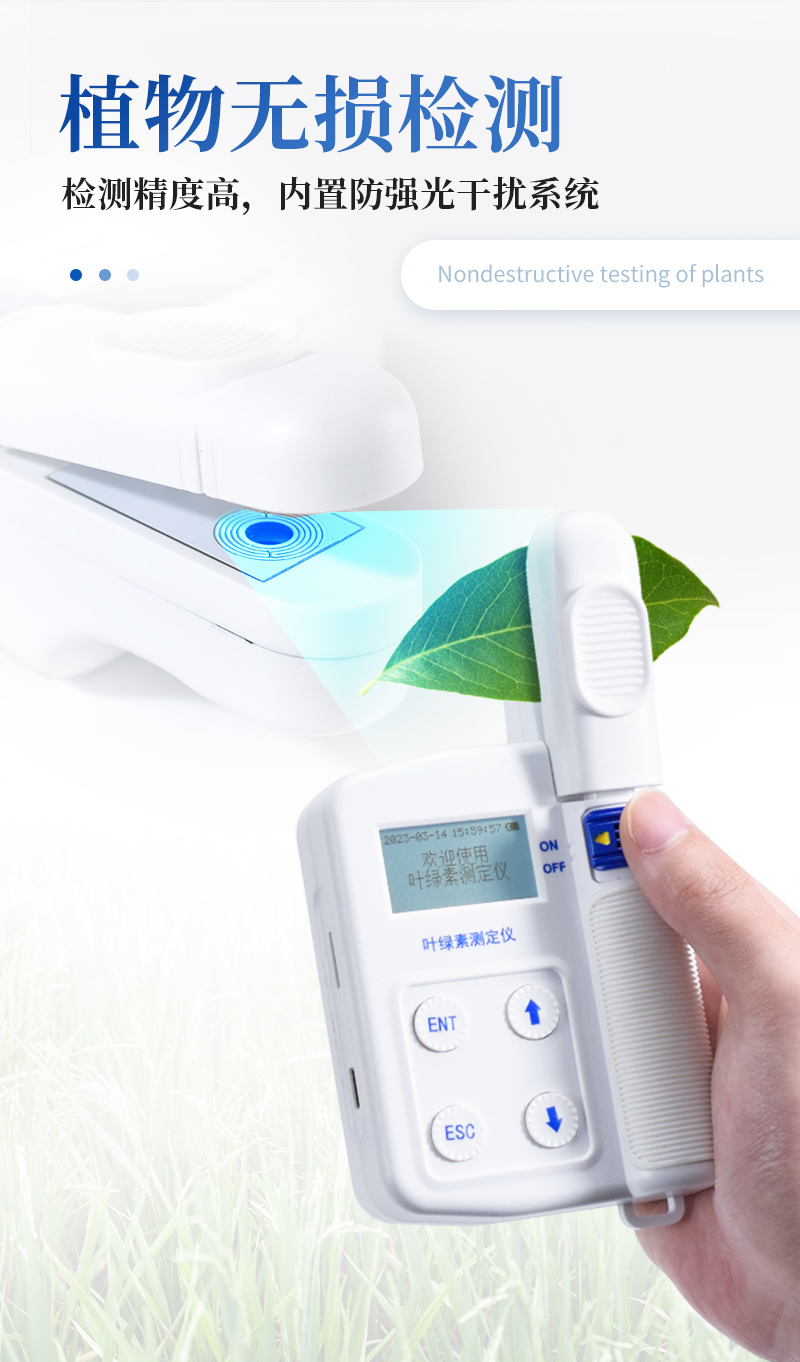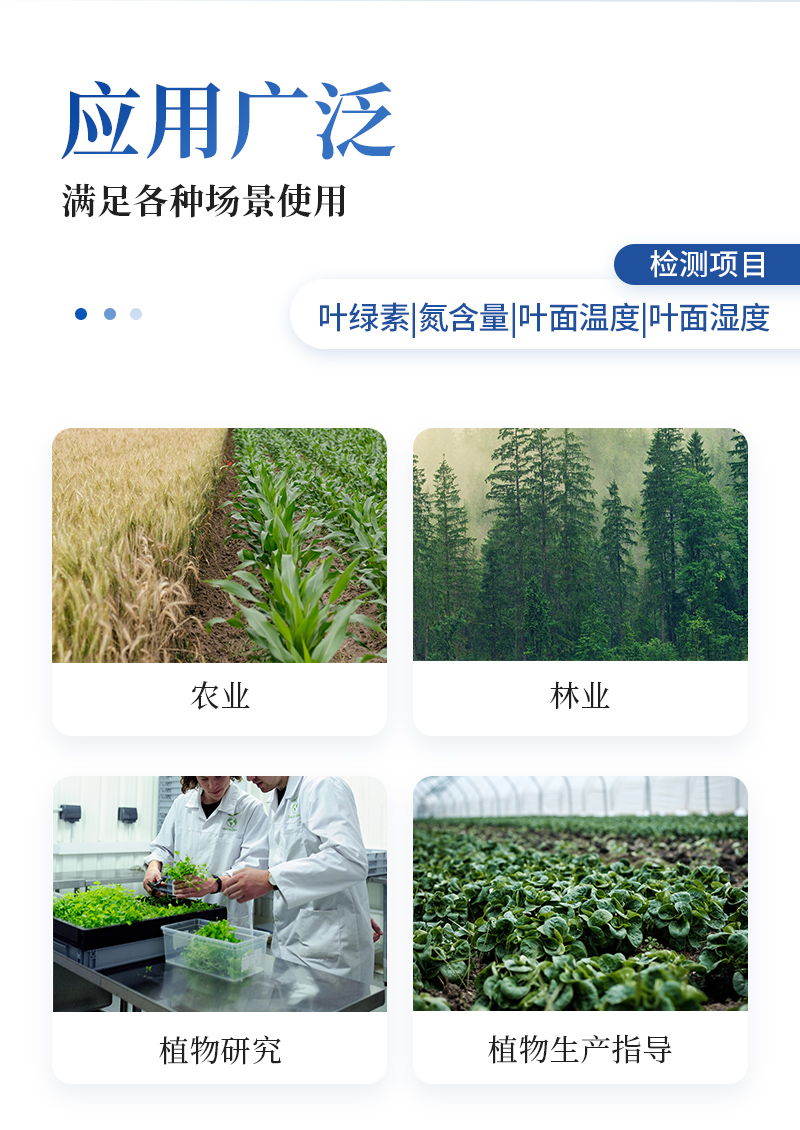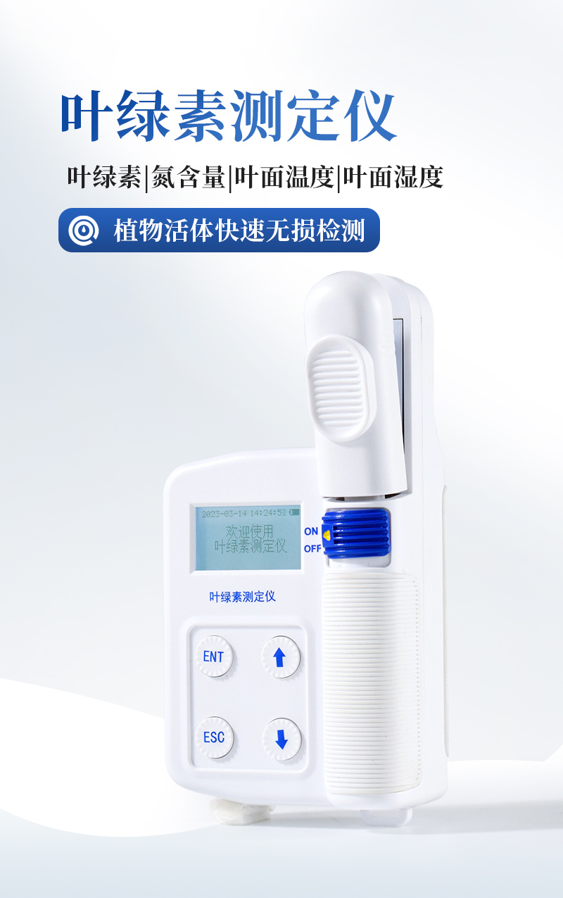 叶绿素测定仪可 以即时测量植物的叶绿素相对含量(单位SPAD)或绿色程度、叶面温度,从而解植物真实的硝基需求量并且了解土壤硝基的缺乏程度或是否过多地施加了氮肥。 可以通过此款仪器来增加氮肥的利用率,并可?;せ肪?。可广泛应用于农林相关科研单位和高校对植物生理指标的研究和农业生产的指导。