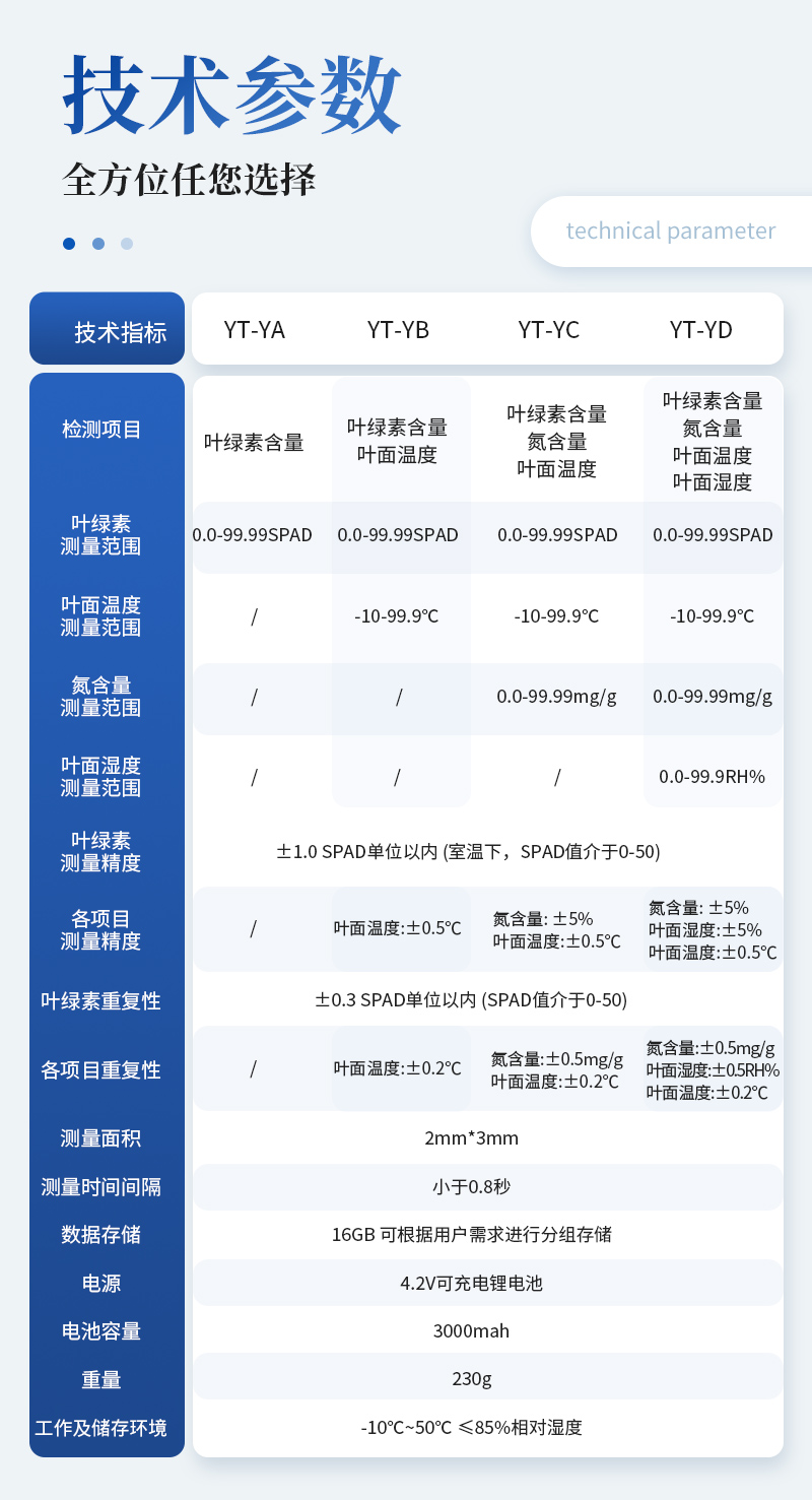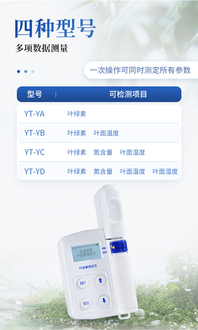 | 叶绿素测定仪YT-YB可同时测量叶绿素、叶面温度两个参数,带上位机软件功能,数据可导出。 | 快速无损植物活体检测,不影响植物成长。 | 一次操作可同时测定所有参数,实时显示,且可同时储存 | 历史数据查看,即可顺序查看,也可跳转查看。 | 测量数据可连接计算机将测量数据导出,便于管理和分析。 | 历史数据查看,即可顺序查看,也可跳转查看。 | 意外断电后已保存在主机里的数据不丢失。 | 对于历史数据即可逐条删除,也可以一键式全部删除。 | 使用锂电池供电,带背光功能。 | 中英文一键式切换。 | 上位机软件功能(YT-YB型): | 每种参数的报表、曲线图均可选择时段查询查看。 | 显示每种参数过程曲线趋势,**值、*小值、平均值显示查看,放大、缩小功能。 | 可将存储记录的数据以EXCEL格式备份保存,方便以后调用。 | 可将存储记录的数据曲线图以BMP图片格式备份保存,方便以后调用。 |