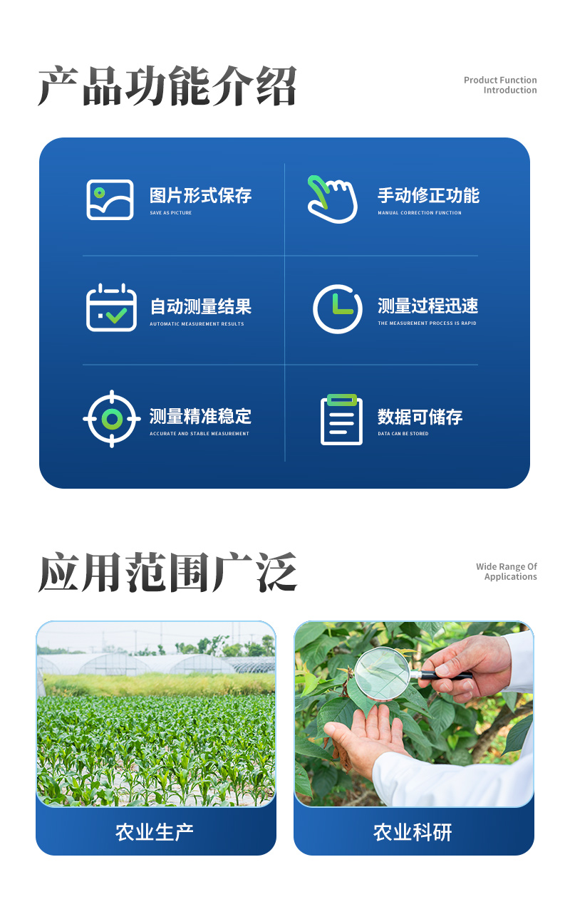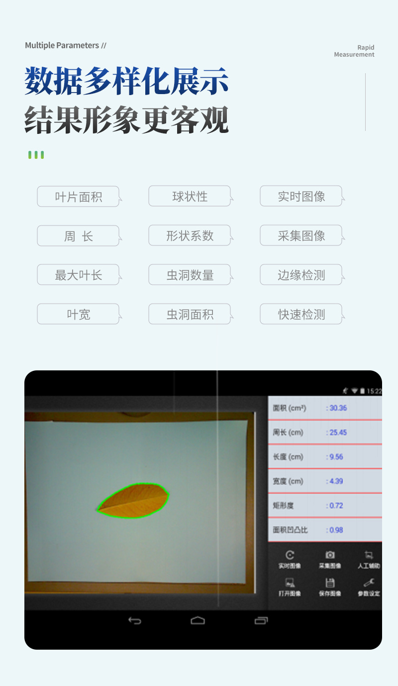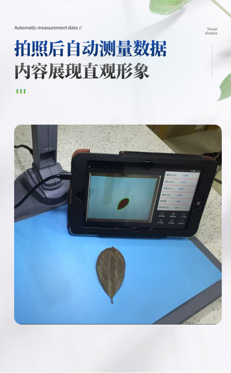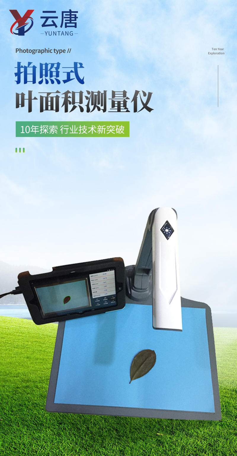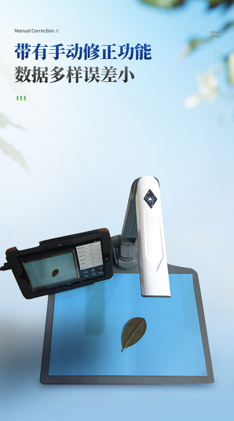 智能拍照式叶面积测量系统由图像采集仪和装入自主开发软件的平板组成,采用本公司多年积累的面积测量算法,根据叶片轮廓特征提取、图形实物转换、边缘检测等技术,能够形象并快速得到所测叶片面积、周长、虫洞数量等参数。相比传统的叶面积,具有测量更快速简便、结果更形象客观、数据多样并大大减少了人为操作带来的误差。