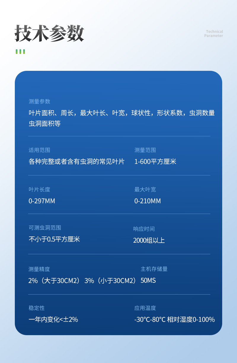 | 测量参数:叶片面积、周长,**叶长、叶宽,球状性,形状系数,虫洞数量,虫洞面积等 | 适用范围:各种完整或者含有虫洞的常见叶片 | 测量范围:1-600平方厘米 | 叶片长度:0-297mm | **叶宽:0-210mm | 可测虫洞范围:不小于0.5平方厘米 | 测量精度:2%(大于30cm2),3%(小于30cm2) | 主机存储量:2000组以上 | 稳定性:一年内变化<±2% | 响应时间:50ms | 应用温度:-30℃-80℃;相对湿度0-100% |