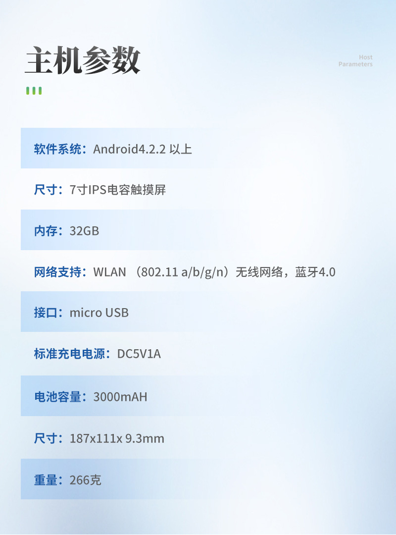 | 软件系统:Android4.2.2 以上 | 尺寸:7寸IPS电容触摸屏 | 内存:32GB | 网络支持:WLAN (802.11 a/b/g/n)无线网络,蓝牙4.0 | 接口:micro USB | 标准充电电源:DC5V1A | 电池容量:3000mAH | 尺寸:187x111x 9.3mm 重量:266克 |