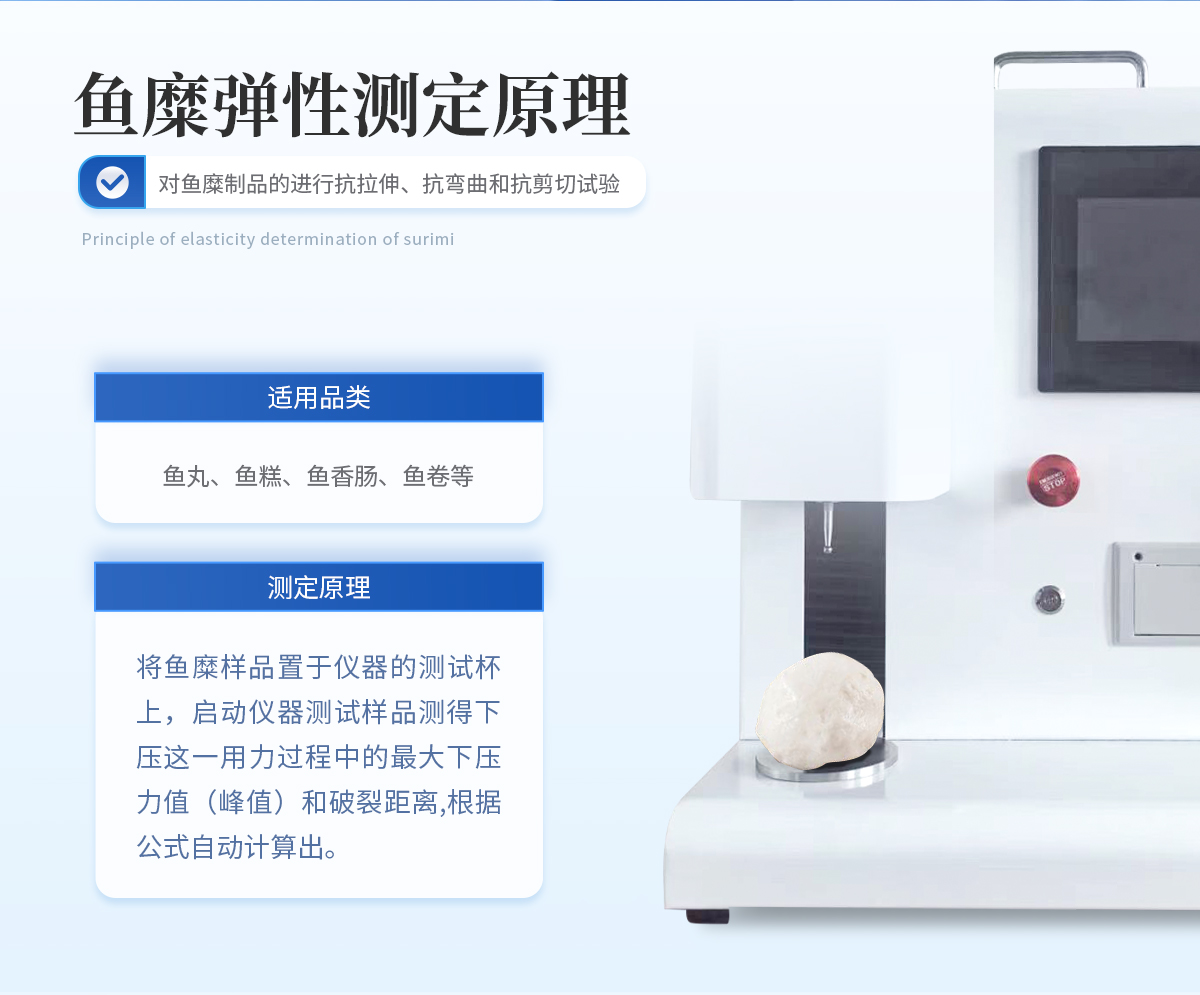 将鱼糜样品置于仪器的测试杯上,启动仪器测试样品,测得下压这一用力过程中的**下压力值(峰值)和破裂距离,根据公式自动计算出鱼糜弹性值。