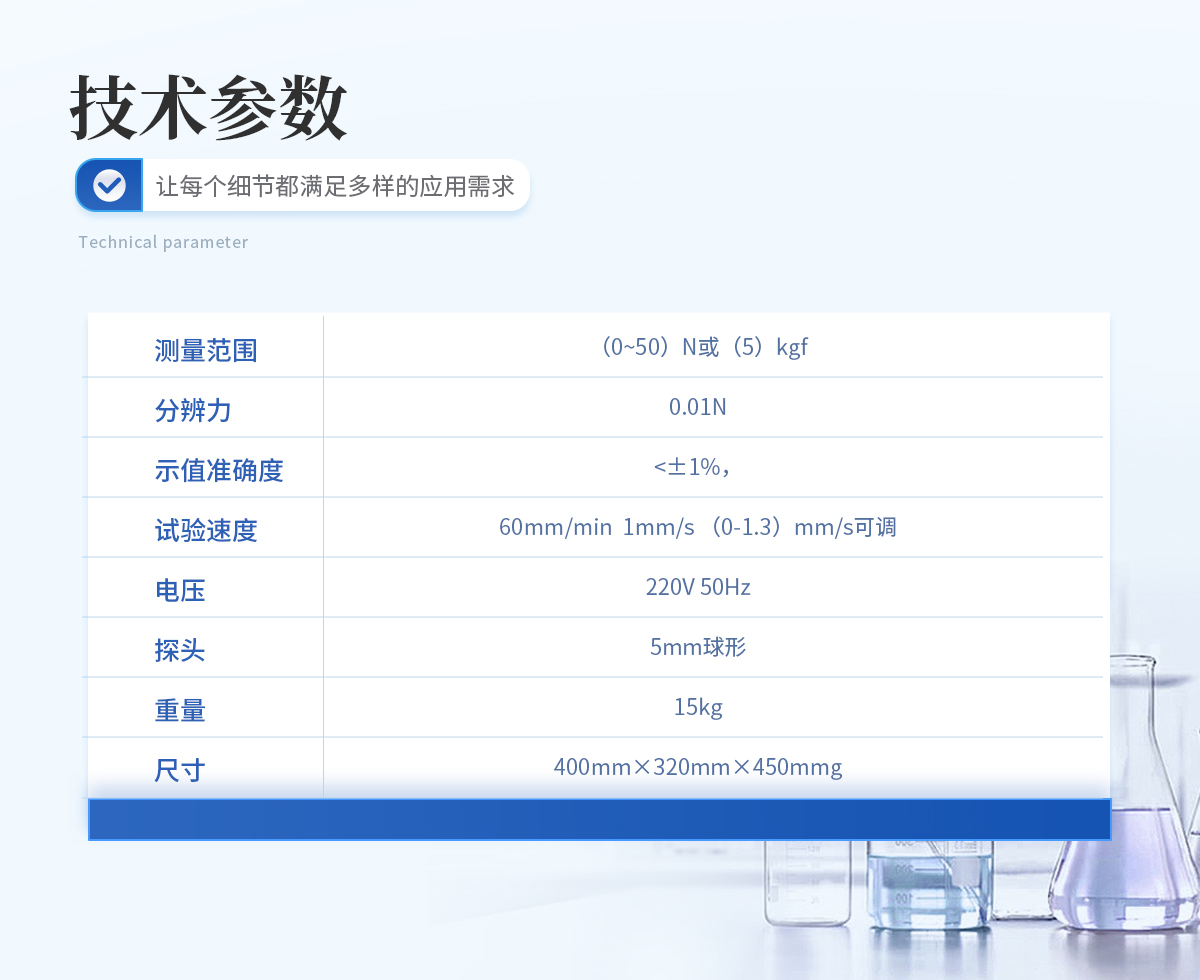 | 测量范围:(0~50)N或(5)kgf | 分辨力:0.01N | 示值准确度:<±1% | 试验速度:60mm/min 1mm/s (0-1.3)mm/s可调 | 电压:220V 50Hz | 探头:5mm球形 | 单位:g.cm | 重量:15kg | 尺寸:400mm×320mm×450mm |