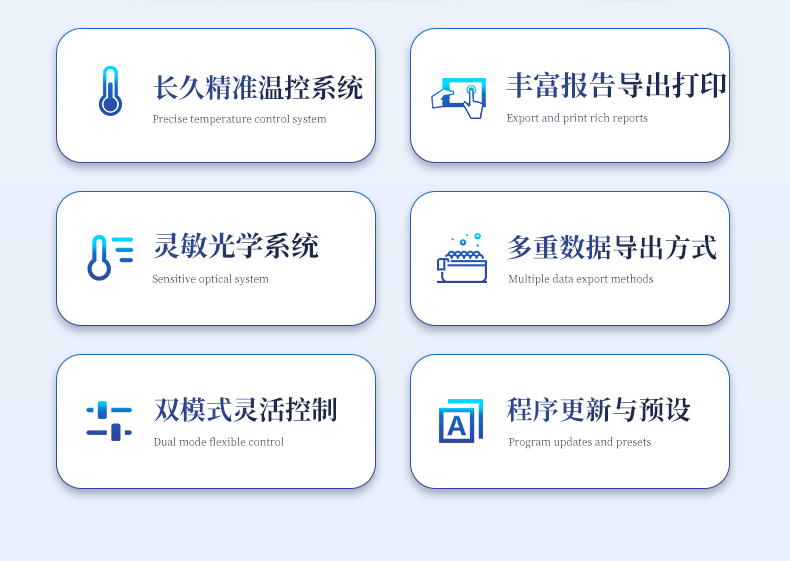 | 基本性能 | 外形尺寸:270*352*195 (mm) | 重量:7.1kg | 电源:220V | 功率:**工作功率300w | 操作系统:自带Android操作系统 | 外接电脑:外接windows电脑(win7系统以上) | 系统语言:中英文实时切换 | 通信接口:方形USB | 操作环境参数 | 操作环境温度:18~35℃ | 操作环境相对湿度:0%~85% | 运输及储存温度:-20~55℃ | 运输及储存相对湿度:0%~85% | 系统性能 | 样品容量:16孔*0.2ml | 样品容积:15~100ul | 适用耗材:0.2ml单管、8×0.2ml排管 | 控温范围:4~99℃ | 热盖温度:30℃-108℃(默认105℃,热盖温度可调) | 温控方式:高性能进口半导体 | 梯度控温:3??樘荻瓤匚?,**温差支持35℃ | 升温速率:4.5℃/s(MAX) | 降温速率:3.4℃/s(MAX) | 控温精度:±0.1℃ | 温度均一性:±0.25℃ | 温度准确度:±0.1℃ | 操作功能:预设项目和分析参数,操作简单方便 | 报告:支持报告自定义模块,16孔分项目打印 | 分析功能:具多重qPCR数据分析功能,可同时检测4个检测通道 | 断电?;ぃ嚎梢砸患仄糁卸系氖笛? | 仪器信息:拥有故障记录,分析,提示的功能,更方便远程解决问题 | 分析算法:扩增曲线,标准曲线定量、熔解曲线,基因分型(SNP),相对定量 | 支持HRM检测:支持 | 数据导出:可将实验结果以图形和表格的形式直接导出;详细的数据报告内容包括实验条件,数据坐标和表格,数据分析参数。 | 数据格式:XLS, CSV, DOCX,PDF | TouchDown功能:支持时间和温度递增递减模式 | 荧光检测系统性能 | 检测灵敏度:可检测单拷贝基因 | 动态范围:1~10^10 | 荧光重复性:CV<1%(使用某品牌试剂做16孔均一性实验,16个孔的Ct差值保持在0.5以内,CV保持在1%以内。) | 相关系数:0.99~1(每种浓度3个重复,梯度曲线的相关系数>0.99,扩增效率保持在99%~101%之间) | 扩增效率:99%~101% | 可信度:区分1000与2000拷贝浓度差异 | 激光光源:大功率LED(免维护,寿命长) | 检测器:高灵敏度光电传感器 | 激发和检测传播介质:耐高温专业导光光纤 | 激发光波长:460nm~480nm , 525nm~545nm, 575nm~595nm ,600nm~620nm | 检测光波长:505nm~525nm , 555nm~575nm , 600nm~620nm , 660nm~680nm |