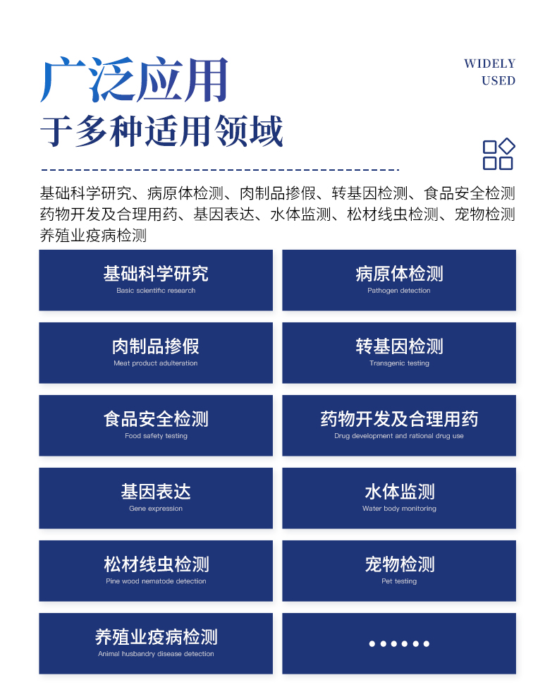 基础科学研究、病原体检测、宠物检测、养殖业疫病检测(牛羊、鸡鸭鹅等禽类、鱼虾等水产)