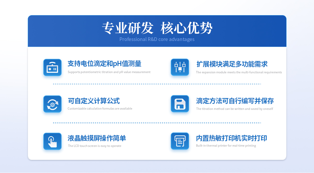 | 1、设备支持电位滴定和pH值测量;用户选择不同电极可进行酸碱滴定、氧化还原滴定、沉淀滴定、络合滴定等多种滴定和pH测量; | 2、用户可选配电导滴定、永停滴定等扩展???,满足用户多功能需求; | 3、设备对****中采用的电位滴定法均满足,用户可根据检测需求选择适配的电极即可; | 4、支持动态滴定、等量滴定、手动滴定的滴定方式,可预设滴定终点或自动识别终点滴定,方便用户根据样品特性选择**滴定工作流程; | 5、可自定义计算公式,根据反应的化学方程式提前设置好计算公式,滴定完成后将自动获得待测物含量; | 6、滴定方法可自行编写并保存,形成滴定方法快捷模式,在使用时可直接选择运行,滴定方法至少可保存100种; | 7、设备可作为实验室常规手动滴定的滴定装置使用;计量泵替代滴定管,磁力搅拌功能替代手动摇晃锥形瓶的工作; |