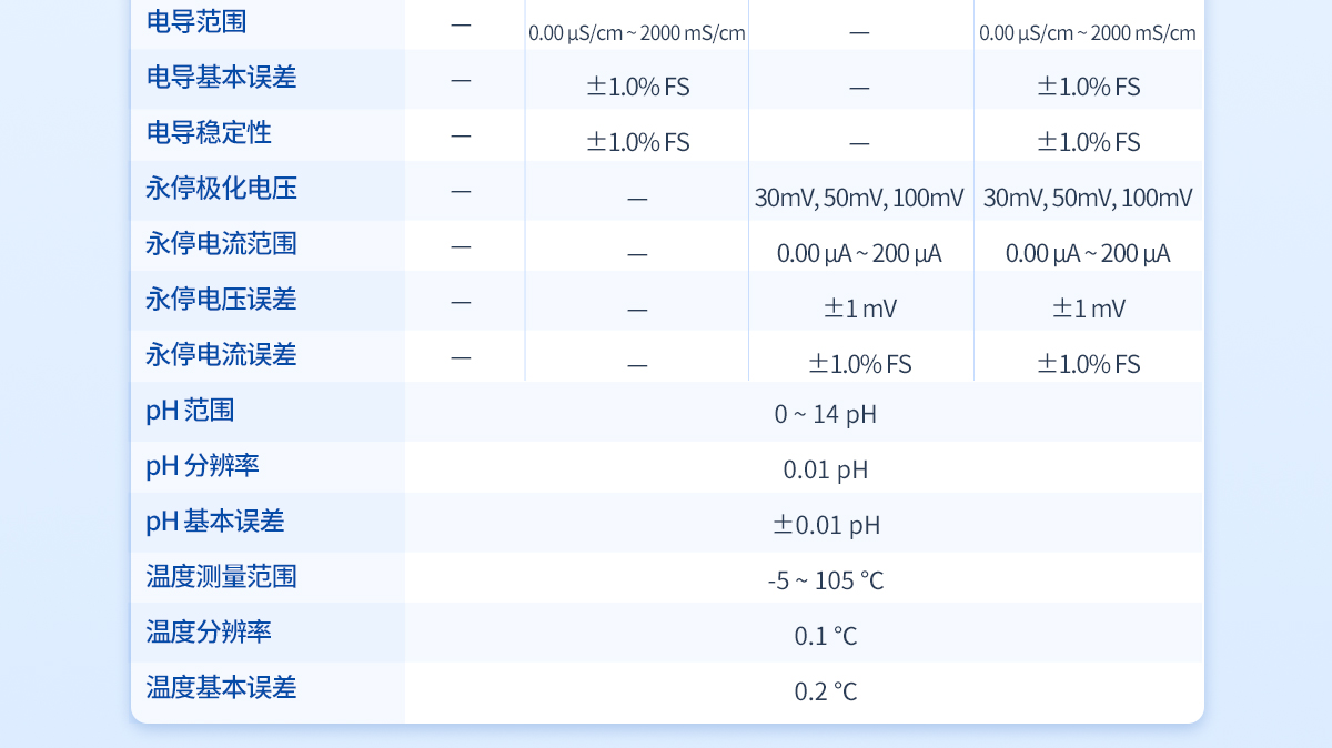 | 滴定分析重复性:≤0.2% | 滴定分析误差:≤1.5% | 10mL滴定管滴定容量精度:±5μL | 20mL滴定管滴定容量精度:±10μL | 10mL滴定管滴定容量误差:10μL/10mL | 20mL滴定管滴定容量误差:20μL/10mL | 电位范围:-2000—2000mV | 电位分辨率:0.1mV | 电位基本误差mV:±0.25‰/FS | 电位稳定性mV:±0.3mV/3h | 永停极化电压:30mV、50mV、100mV | 永停电流范围:0.00uA-200uA | 永停电压误差:±1mV | 永停电流误差:±1.0% FS | pH范围:0-14PH | pH分辨率:0.01PH | pH基本误差:±0.01PH | 温度测量范围:-5 - 105℃ | 温度分辨率:0.1℃ | 温度基本误差:0.2℃ |